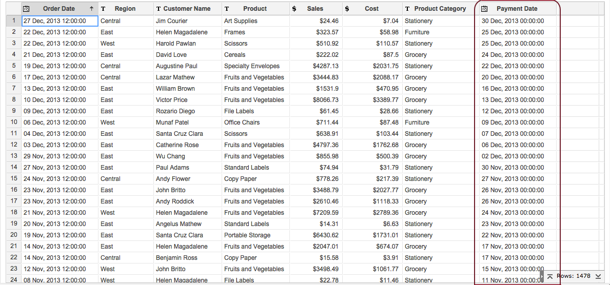The following screenshot shows the Payment Date formula column listed in the columns list page: