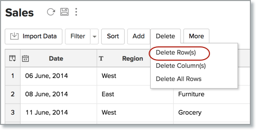 You can delete one or more rows from a Zoho Analytics table. This section explains how to delete a row or multiple contiguous rows from a Zoho Analytics table.