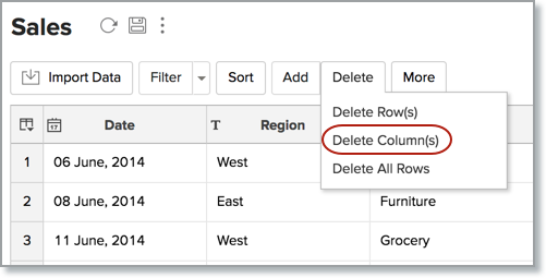 You can delete one or more columns from a Zoho Analytics table. This section explains how to delete a column or multiple contiguous columns from a table.