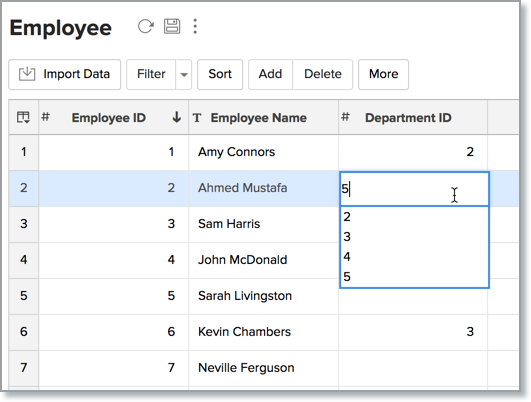 In Zoho Analytics, Lookup column field displays the looked up column values as a list in a combo box to choose values instead of typing them in. Let's say a new Department ID Lookup column has been added to Employee table, whose values will be looked up from Department ID in the Department table. When editing a lookup column field, all the Department IDs existing in Department table will be displayed as a list of choices in a combo box as shown below, so that you can choose the appropriate department the Employee belongs to.