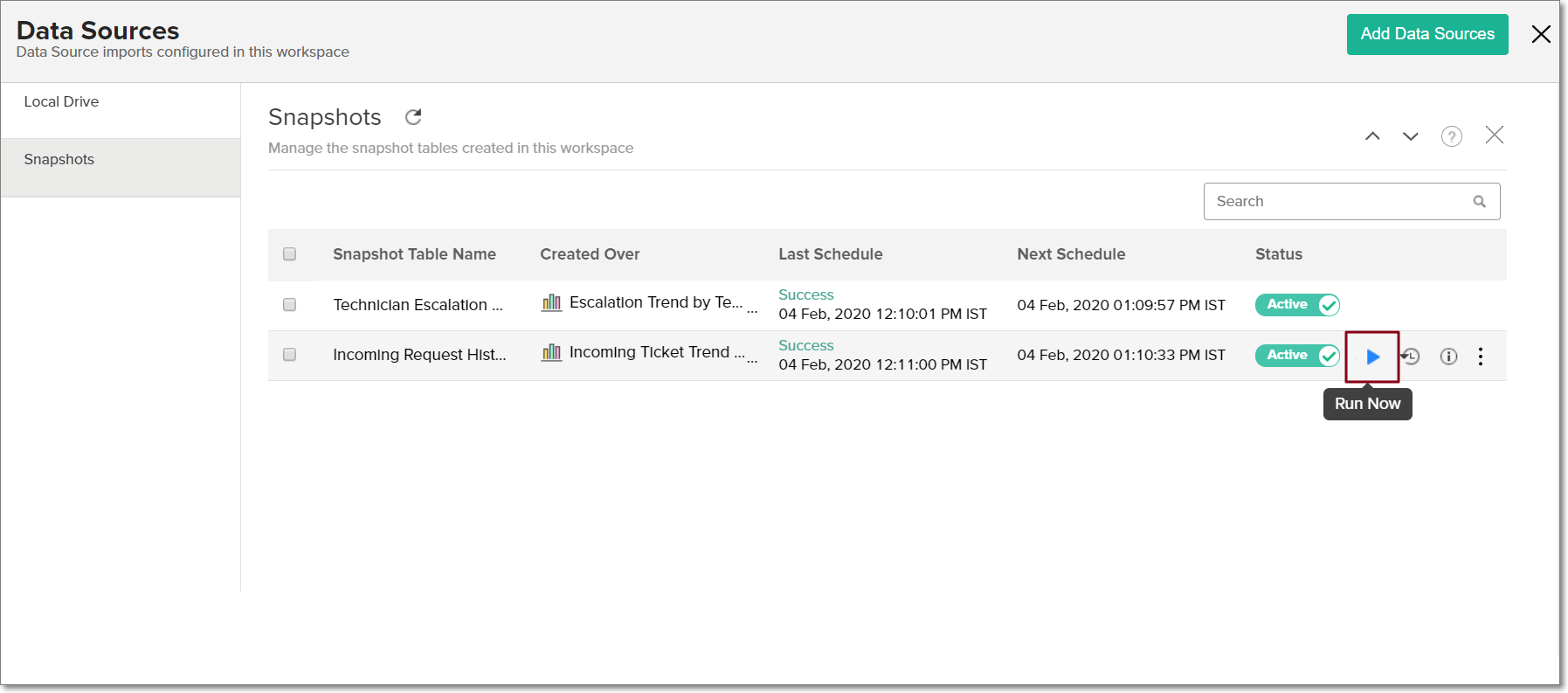 To do this, click the Data Sources button from the side panel and navigate to the Snapshots section. Click the Run Now button that appears on mouse over the required snapshot. The Snapshot will run instantly and import data from the report.