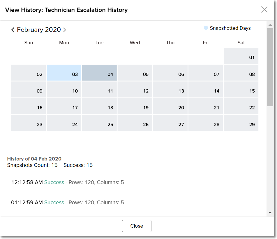 In the screen that appears, the days when the report's data was recorded will be displayed in a calendar view. Clicking on a particular date will display details of the snapshots run on that day, with information about the time of data fetch and the number of rows and columns imported.