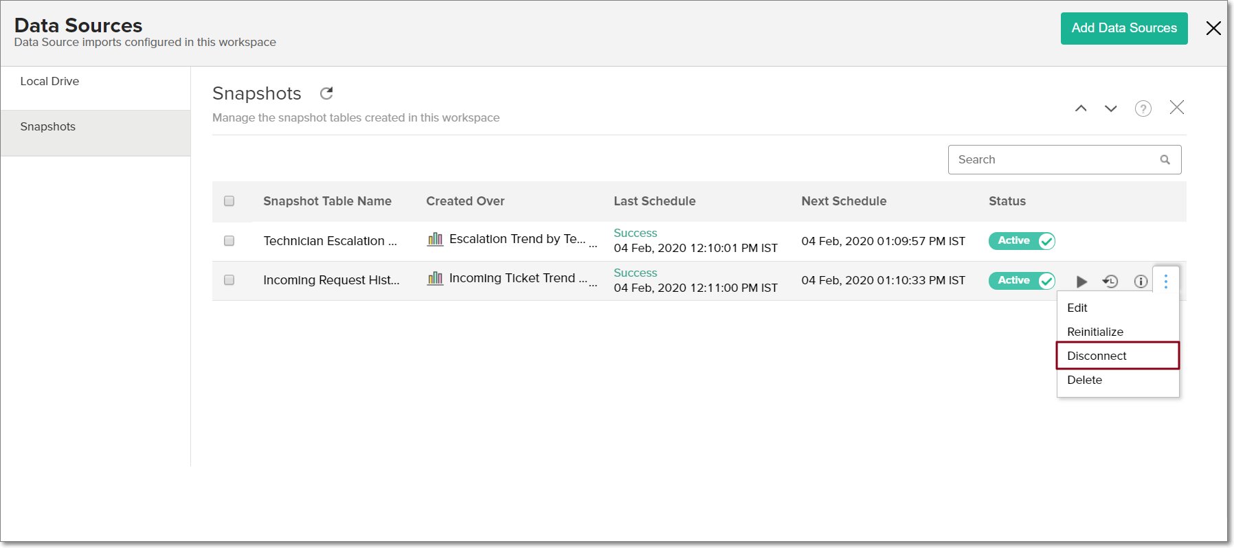 Click the More Actions icon that appears on mouse over the required snapshot, and select the Disconnect option. The Data Snapshot will be disconnected from its corresponding report. However, you will still be able to access the existing data in the snapshot table.