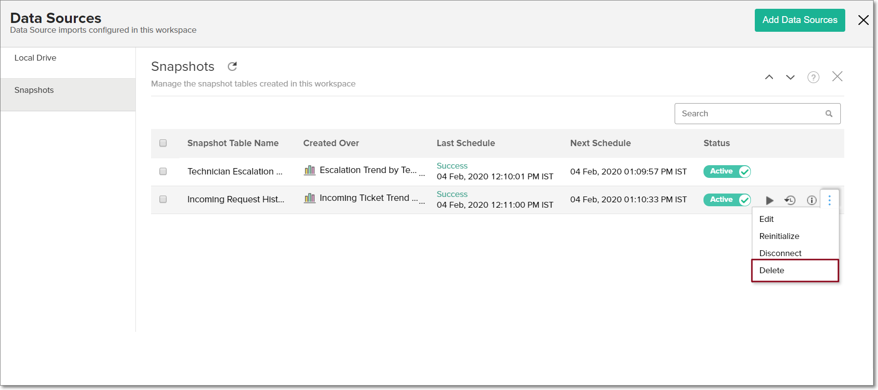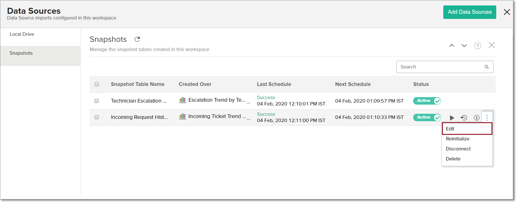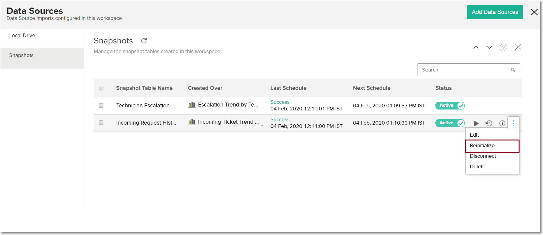 To do this, click the Data Sources button from the side panel and navigate to the Snapshots section. Click the More Actions icon that appears on mouse over the required snapshot, and select the Reinitialize option. This removes the existing records from the corresponding snapshot table, and new records will be added at the scheduled interval.