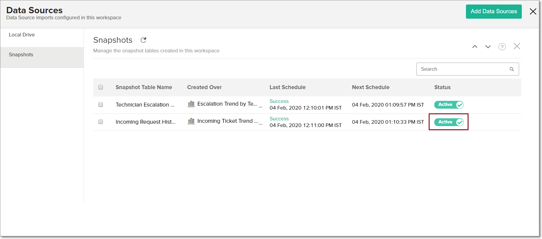 To do this, click the Data Sources button from the side panel and navigate to the Snapshots section. Click the Info icon that appears on mouse over the required snapshot to view its details.