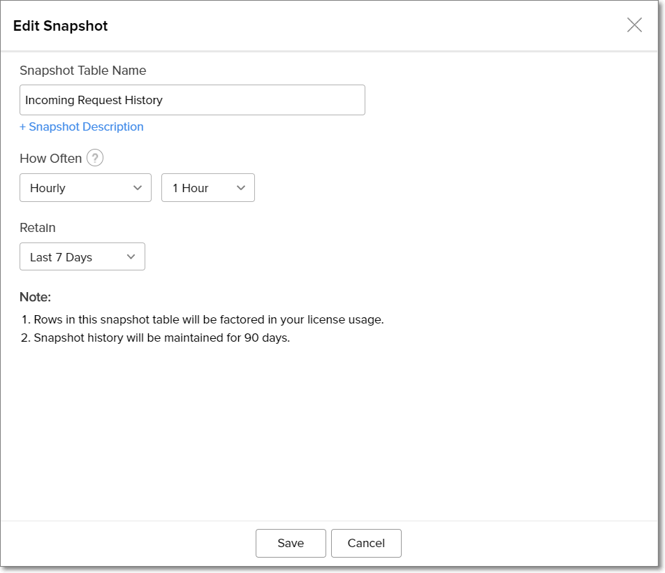 In the Edit Snapshot screen that appears, edit the name, data retention period and the data schedule interval as needed, and click Save.