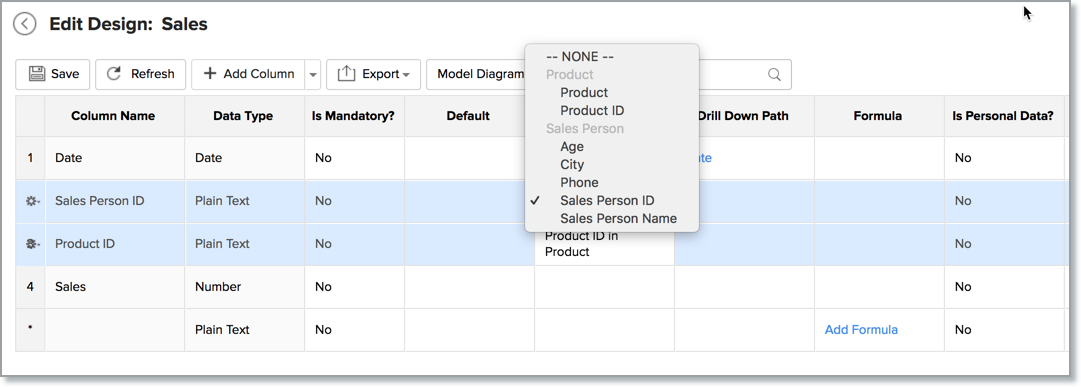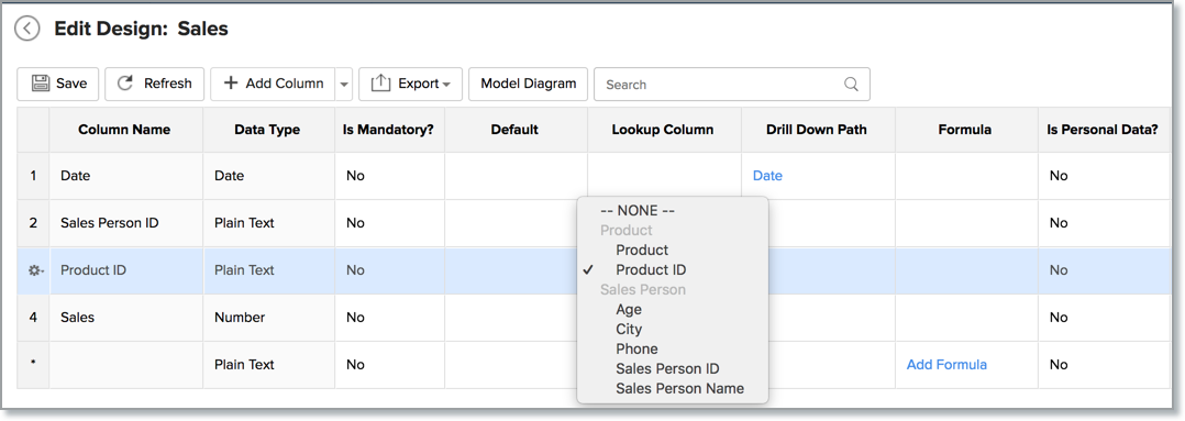 Given these related columns we can define lookup relationship between Sales and Sales Person table through the column Sales Person Id. Similarly between Sales and Product Details tables a lookup relationship can be established based on the common column Product_ID. Once the lookup column relationship is defined Zoho Analytics will automatically join data from these tables using the Auto-join feature, when you start creating reports based on these tables.