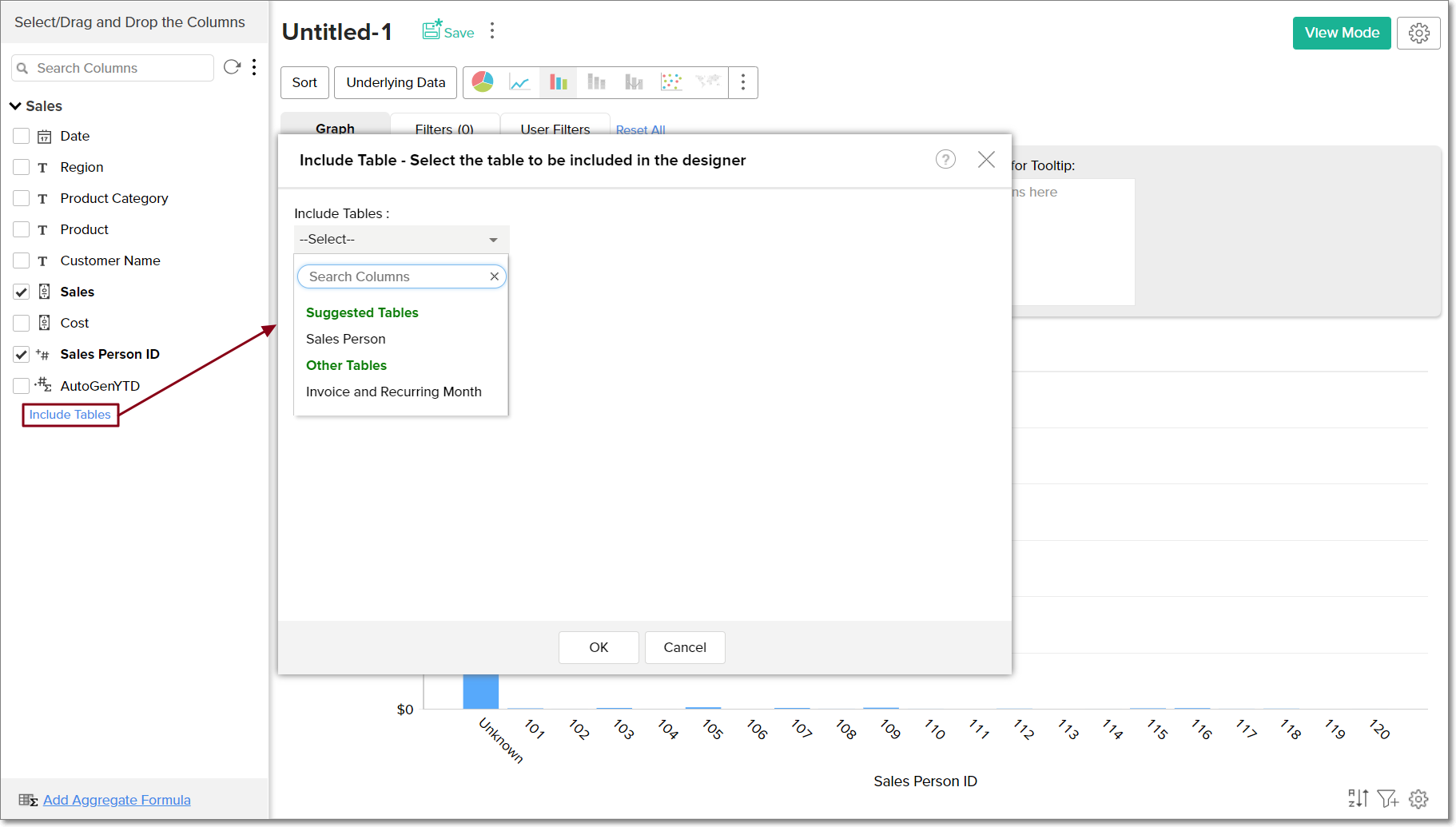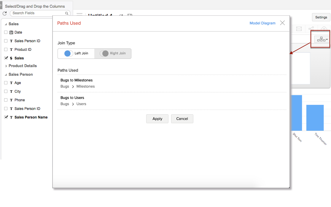 Zoho Analytics allows you to join tables from the report editor when you need to include data from another table. Let's say you want to create a report on Sales by Sales Person. Your Sales table data might just have the Sales Person ID. You can add the Sales Person Name from Sales Person table. The following section explains how this works.