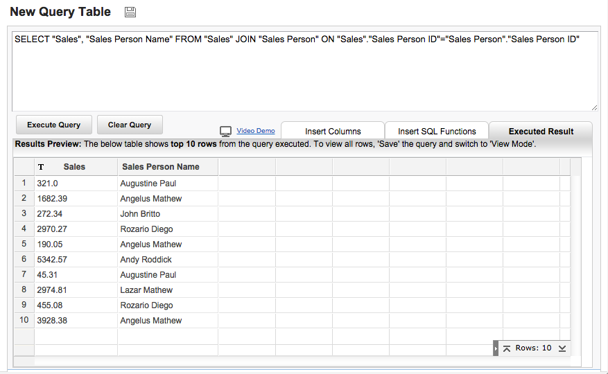 For example, a query to combine the Sales and Sales Person tables and to retrieve Sales made by each Sales Person data can be created as shown below.