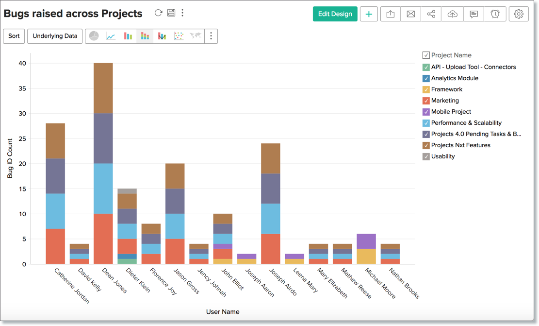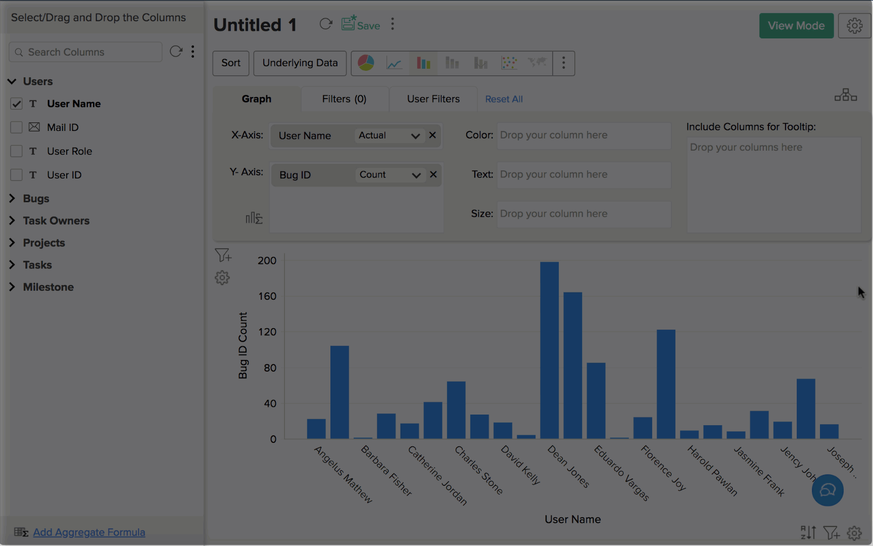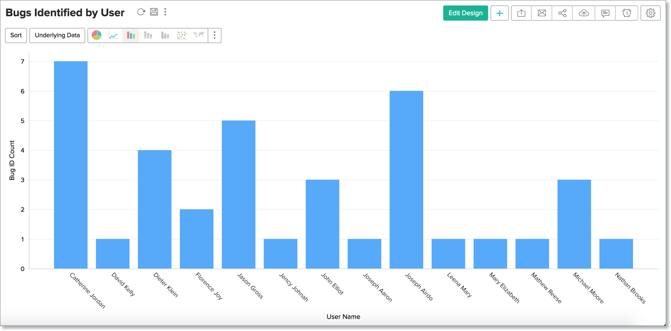 In the above-given model, let's see an example of creating the report Bugs Identified by User. By default, when you plot a report for Bugs identified by each user, Zoho Analytics could use the Assignee ID lookup to Users table, which is not correct as it will provide the Bugs assigned to each user.