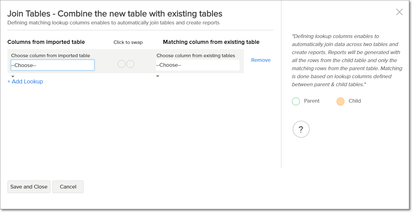 You can define lookup form your existing table or while importing. You can also define a lookup from the report editor. The following section explains how to define lookup between tables.