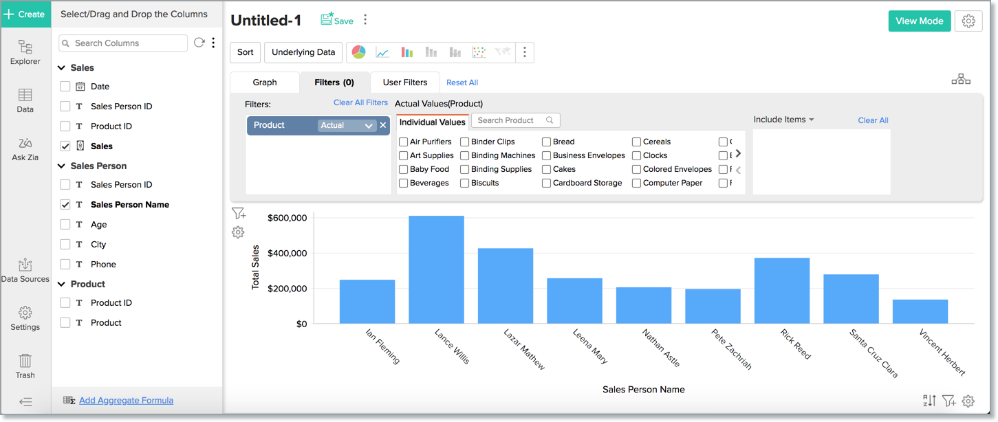 Also, columns from the related tables can be used to filter the report. Continuing the above example, Product Name column from Product Details table can be used to filter the chart data and display Sales made by the Sales Person for the selected Products as shown below.