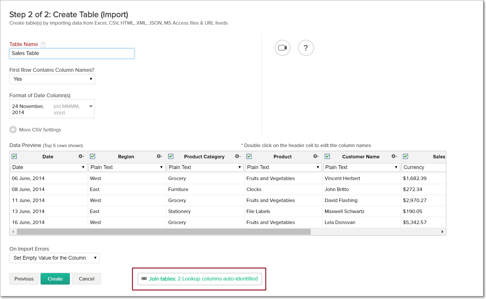 Zoho Analytics auto identifies similar columns and provides suggestions for lookup while importing data. The following section explains how this works.