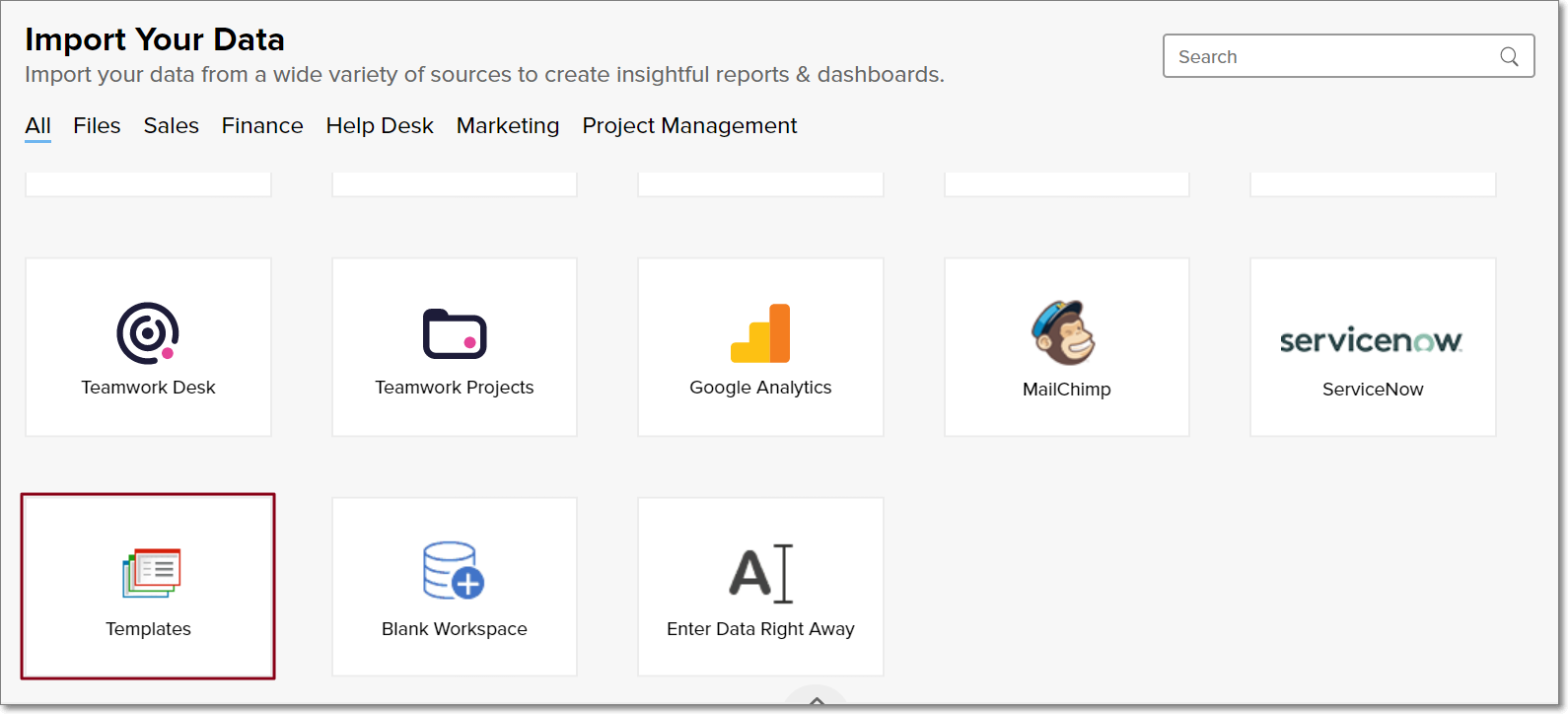 Log in to Zoho Analytics, click on the Import Your Data button found at the top right corner of the screen, and select the Templates option.