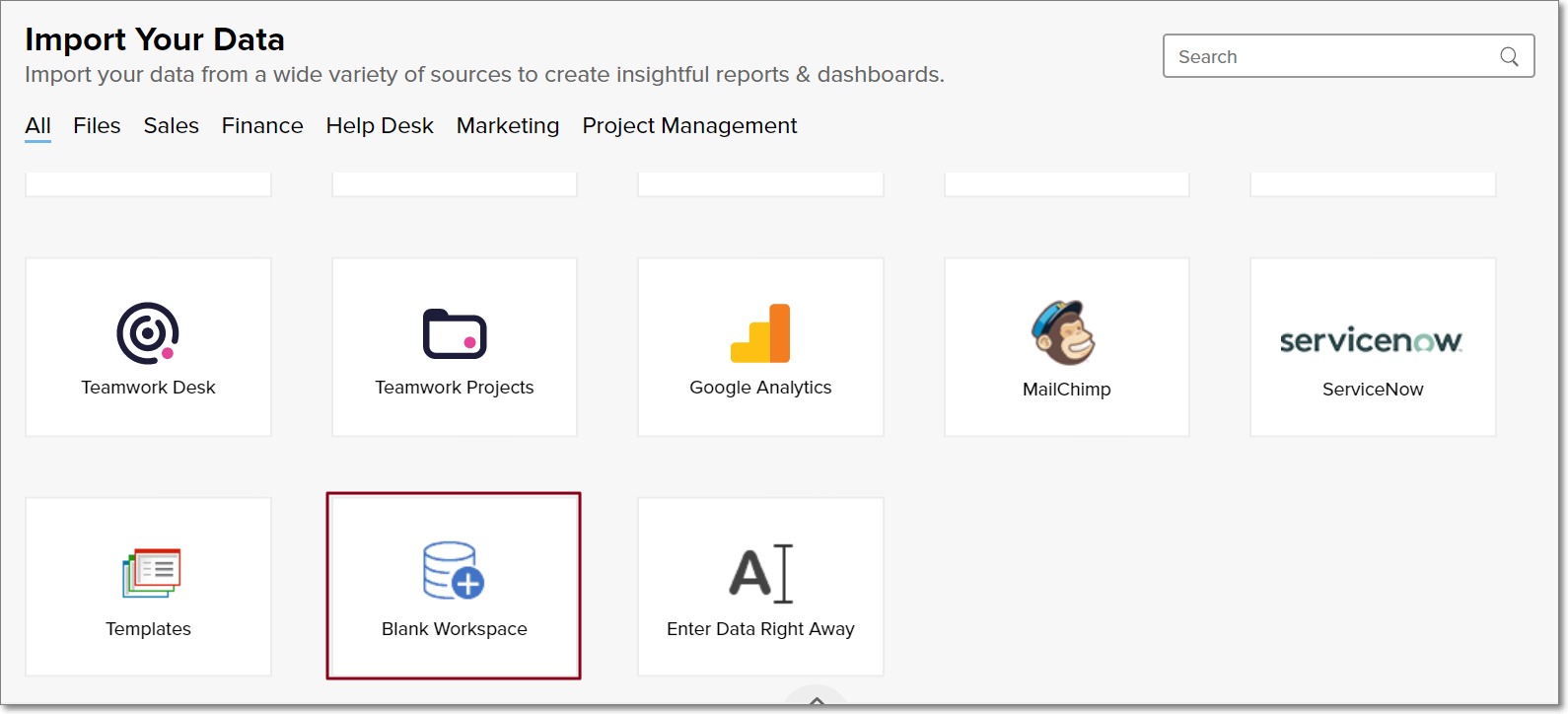 Zoho Analytics provides the following options for creating workspaces: