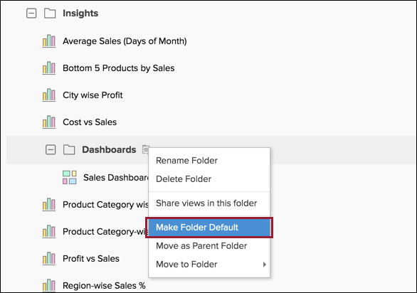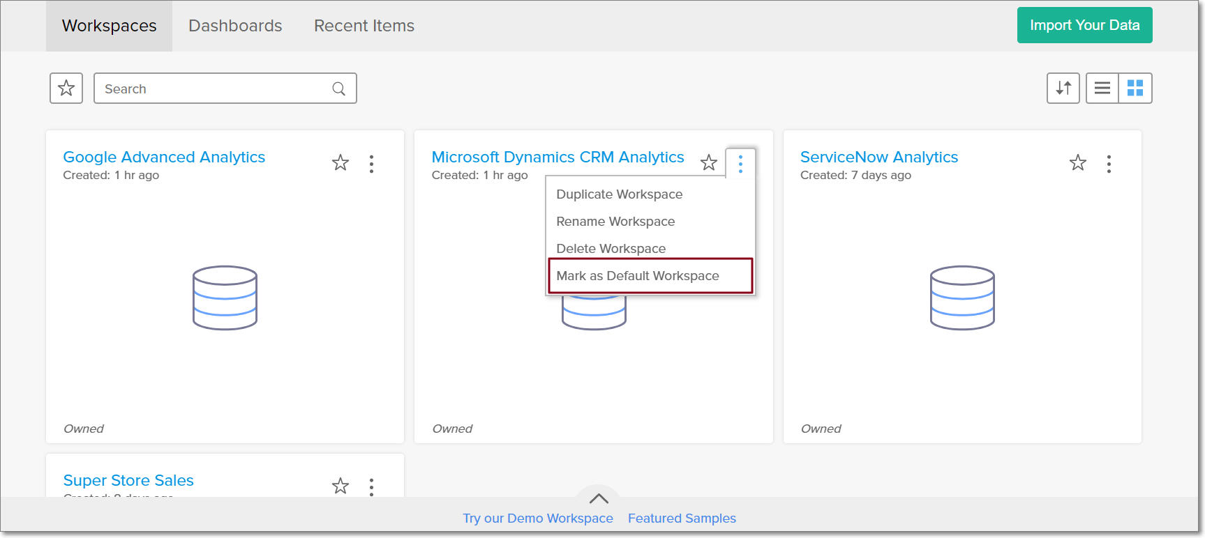 Setting a default workspace ensures that the workspace will be opened when accessing Zoho Analytics. Follow the steps below to set a workspace as default in Zoho Analytics.