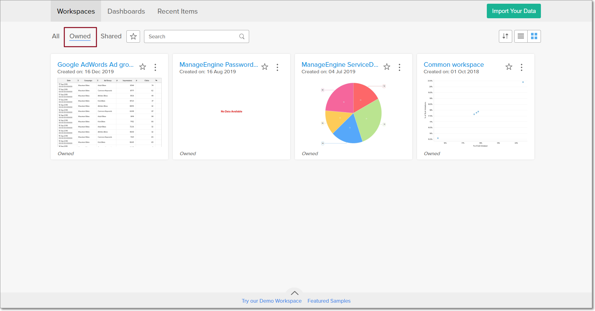 All the workspaces that you have access to will be listed in the Workspaces tab of the Zoho Analytics homepage. To view the workspaces that you have created, click the Owned button.