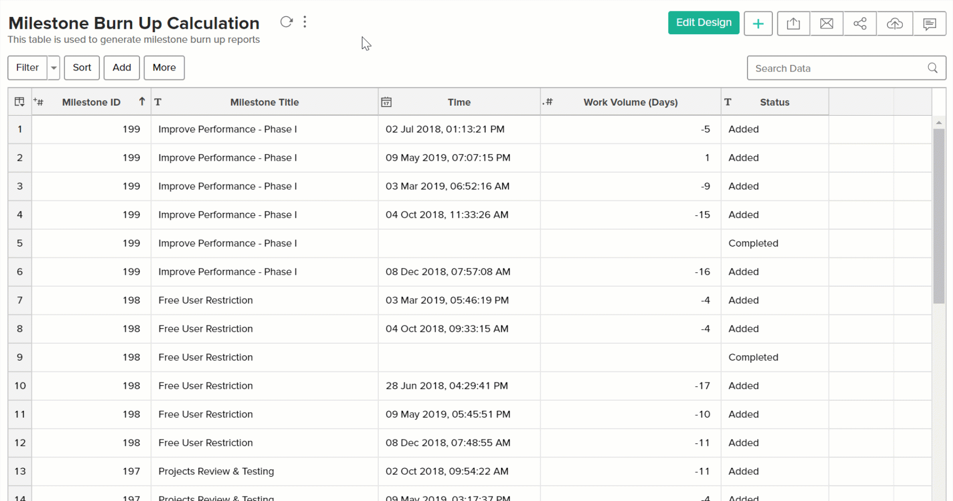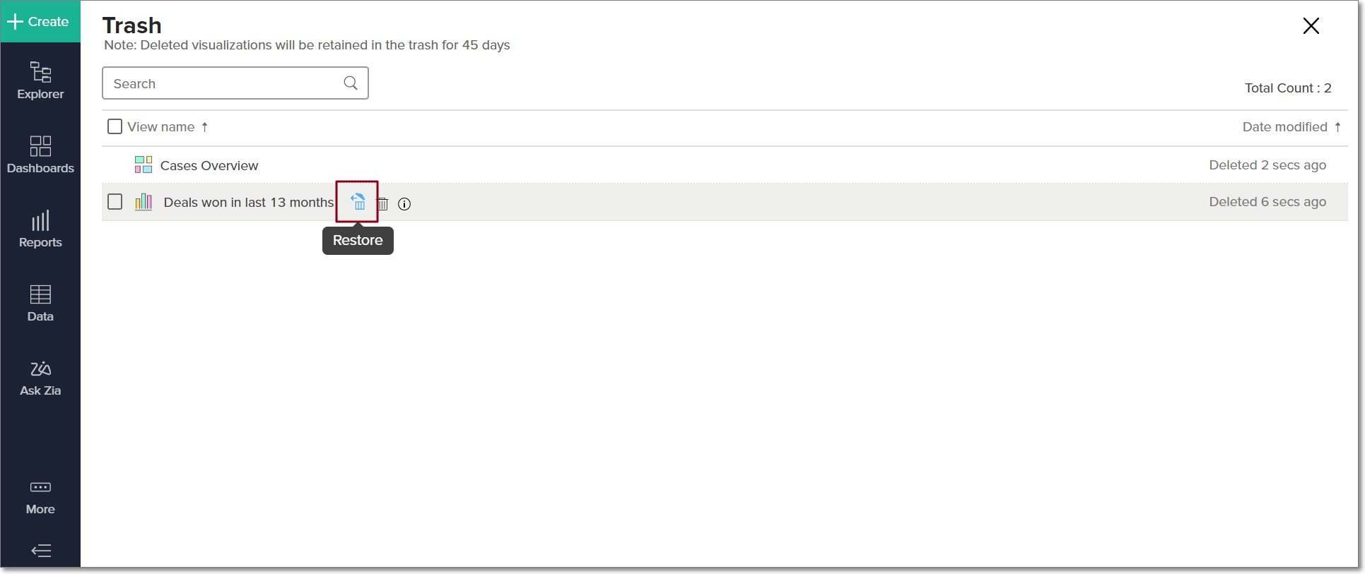 To recover deleted reports, dashboards and tables in Zoho Analytics, click the Trash option under the More button from the side panel. This opens the Trash page, which lists the views that have been recently deleted in the workspace. Navigate to the required visualization, and click the Restore button that appears on mouse over.