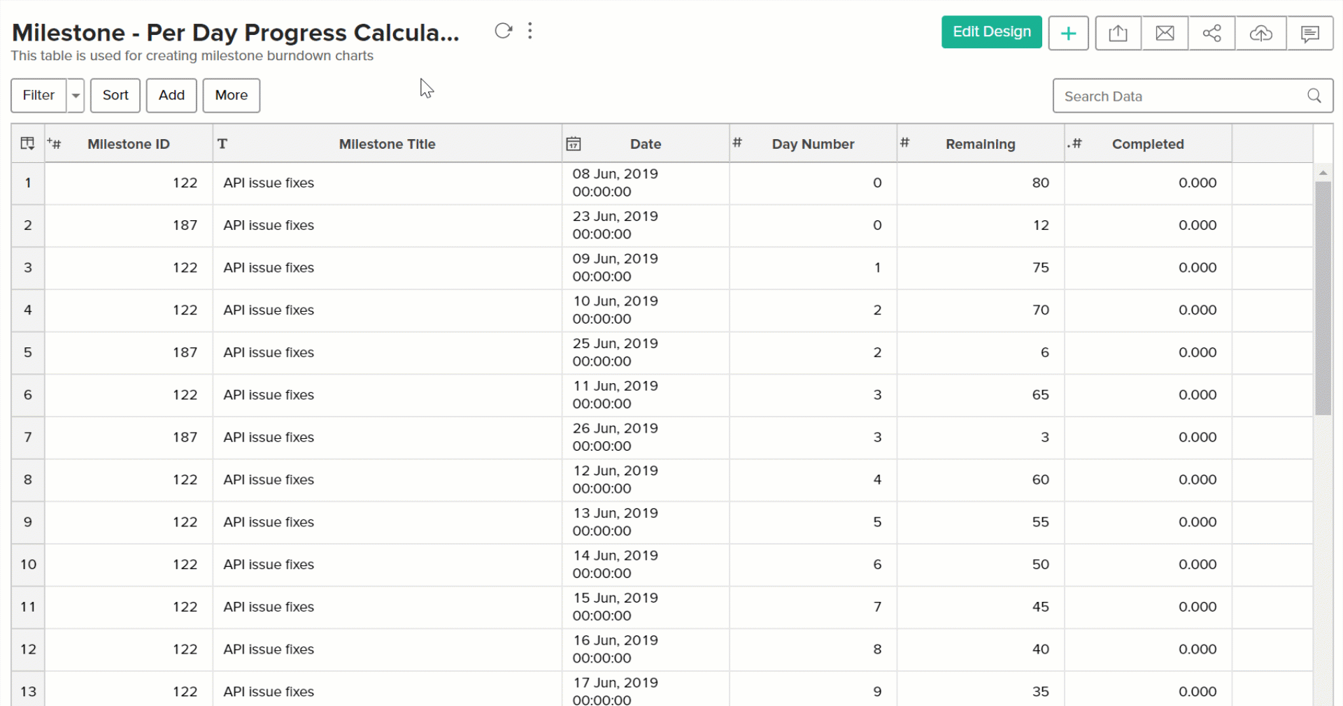If the views in the Explorer page are displayed as grids, click the More Actions icon on the top right corner of the required report, dashboard or table. If the views are displayed in a list, click the Actions icon that appears near the report, dashboard or table name on mouse over.