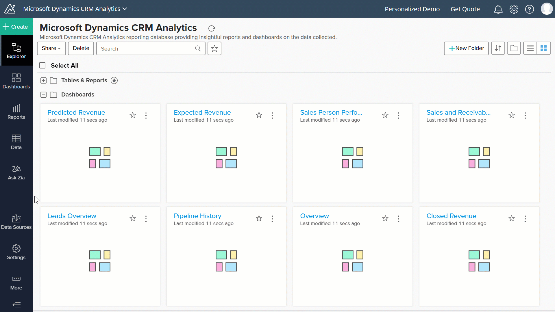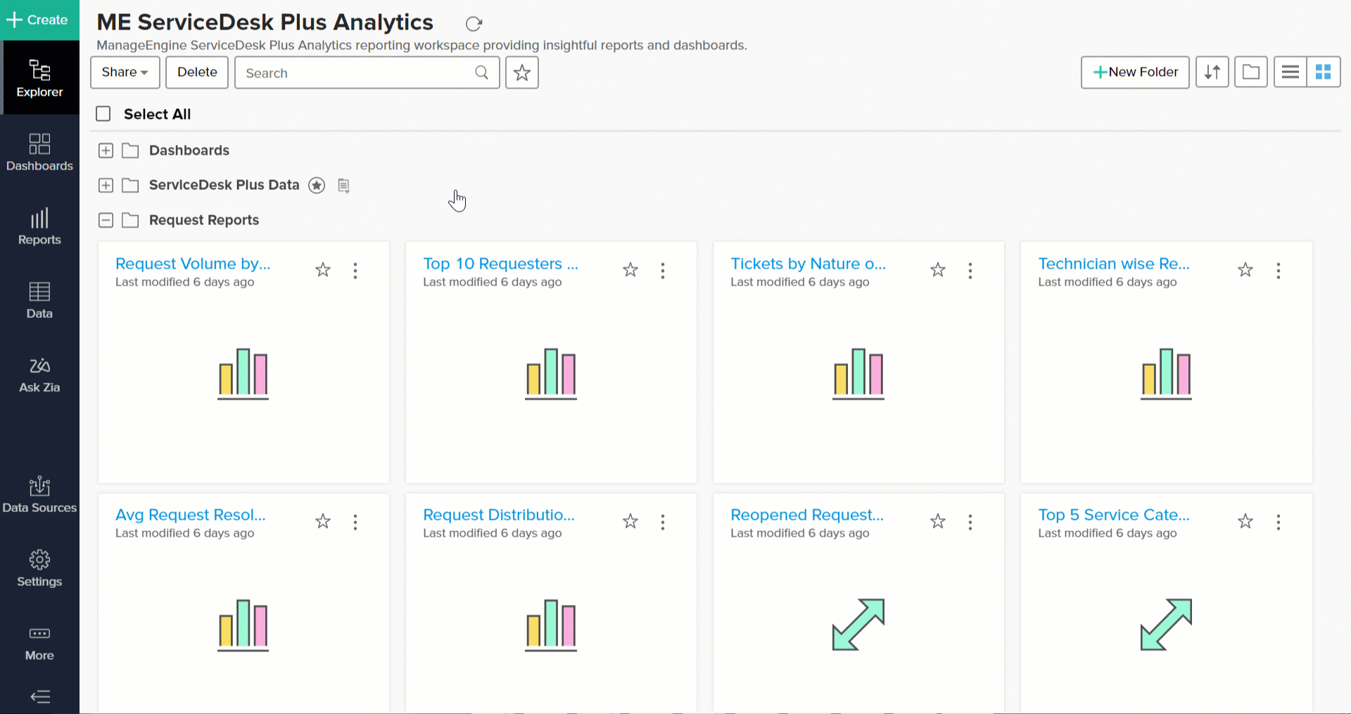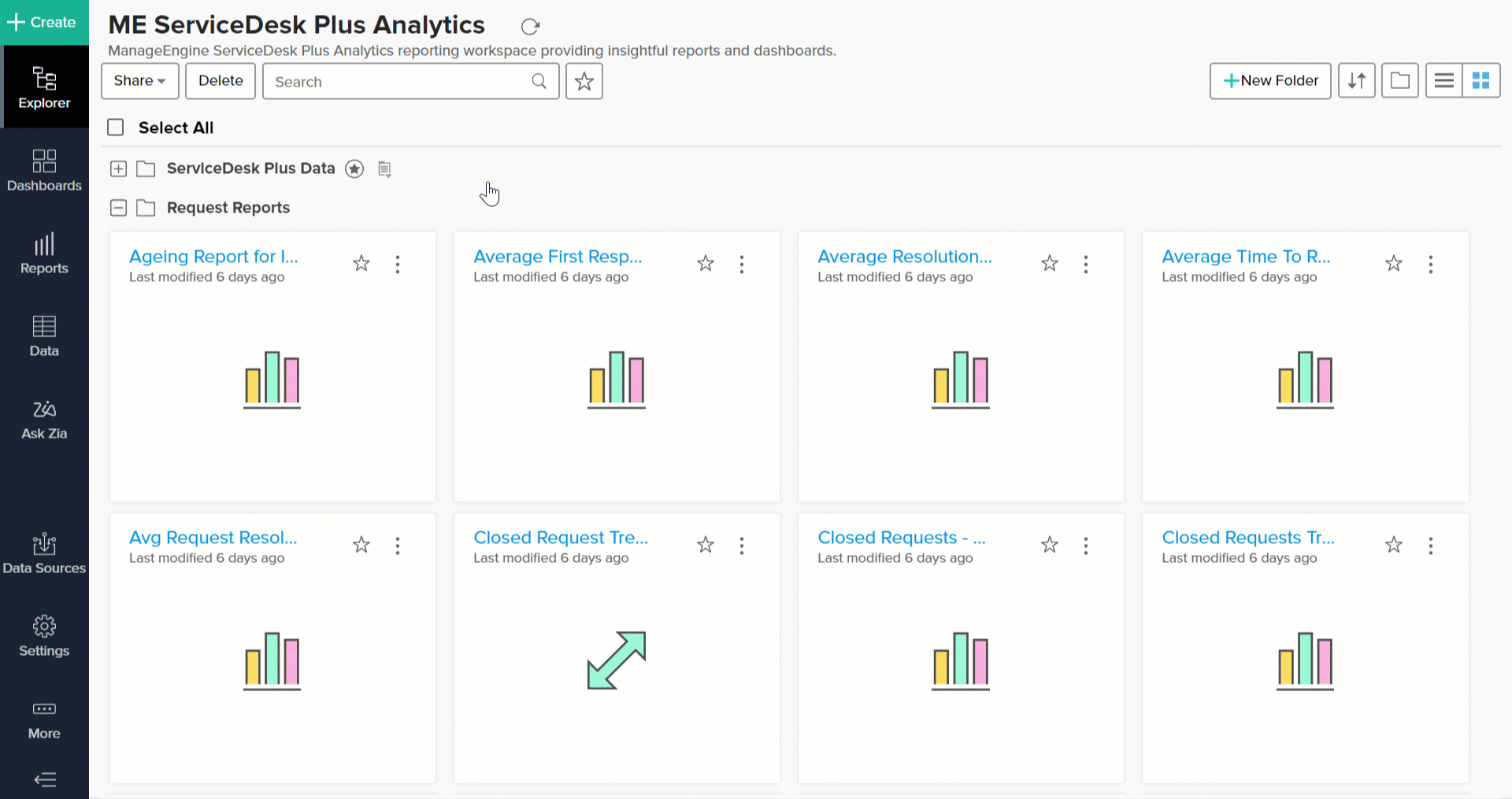 Zoho Analytics provides a powerful search engine in the Explorer page, which enables you to find a specific view within seconds. To do this, type in the name of the report, dashboard or table in the Search bar at the top of the Explorer page. You can filter the search results further, by selecting the type of view that is to be displayed.