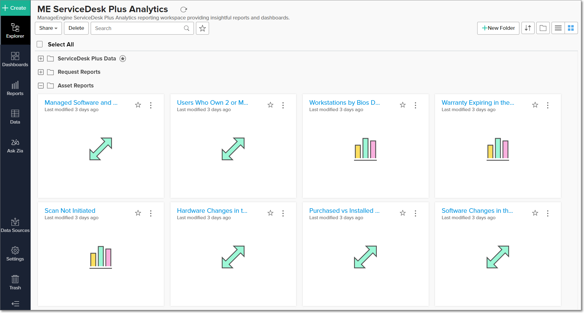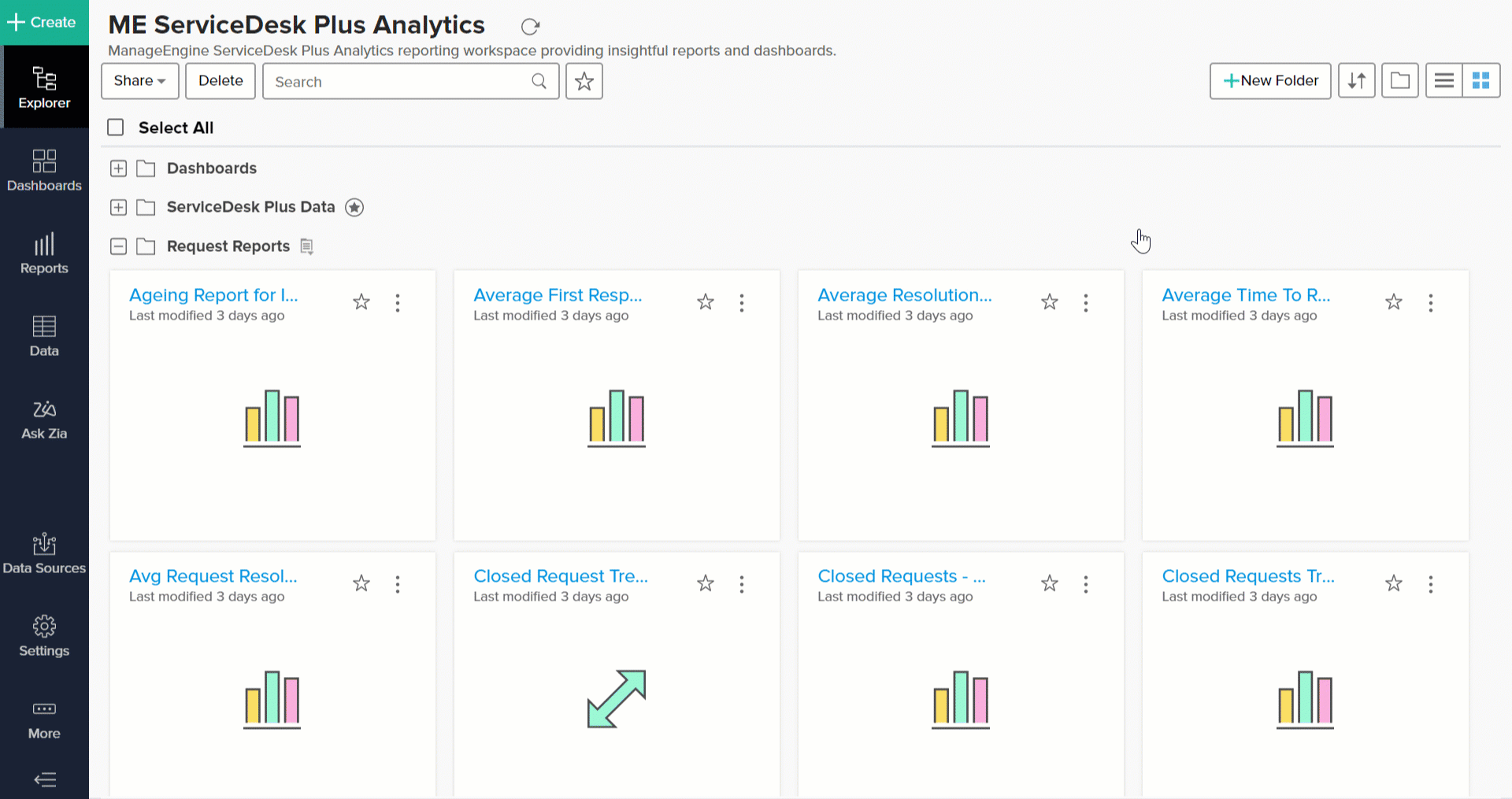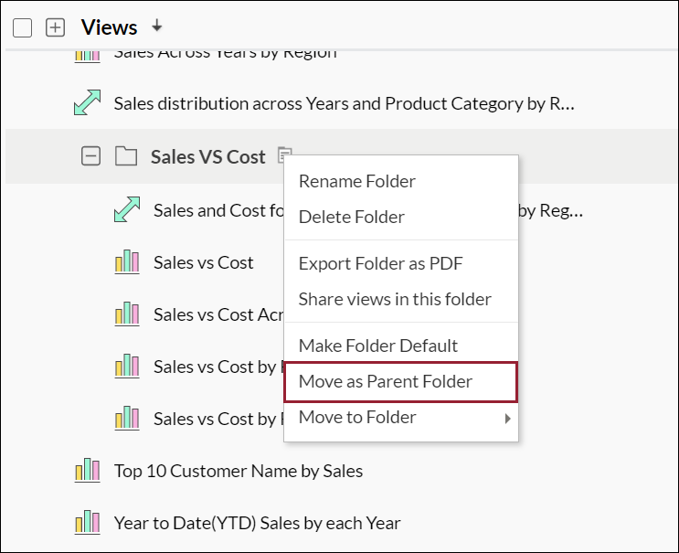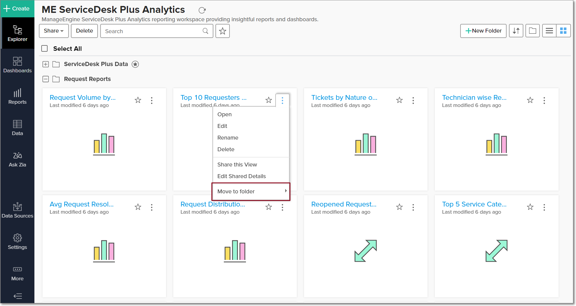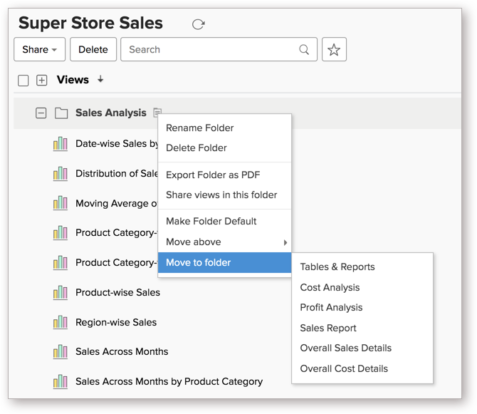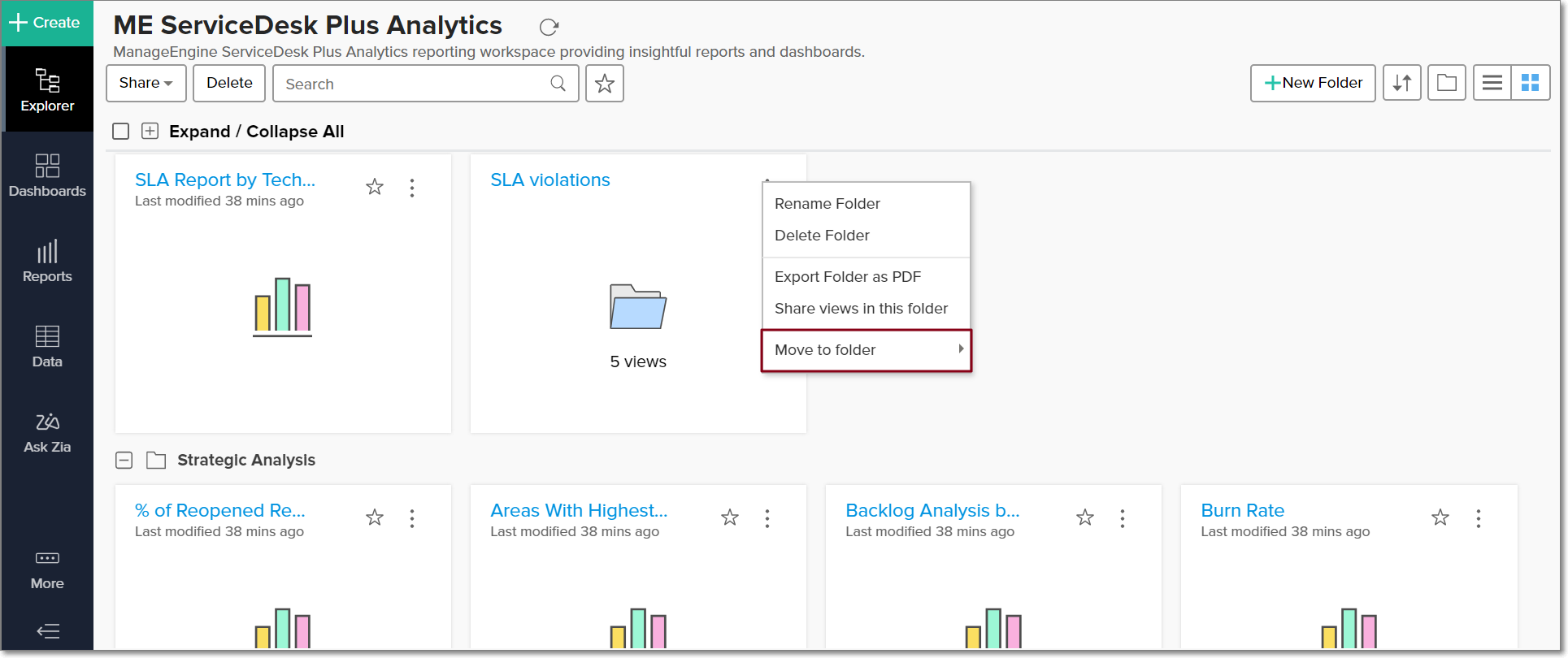 You can easily move reports, dashboards or tables from one folder to another within a workspace in Zoho Analytics. Follow the steps below to do this.