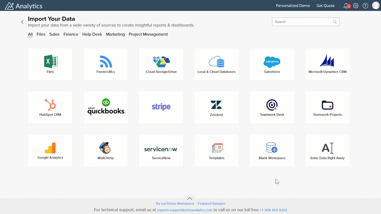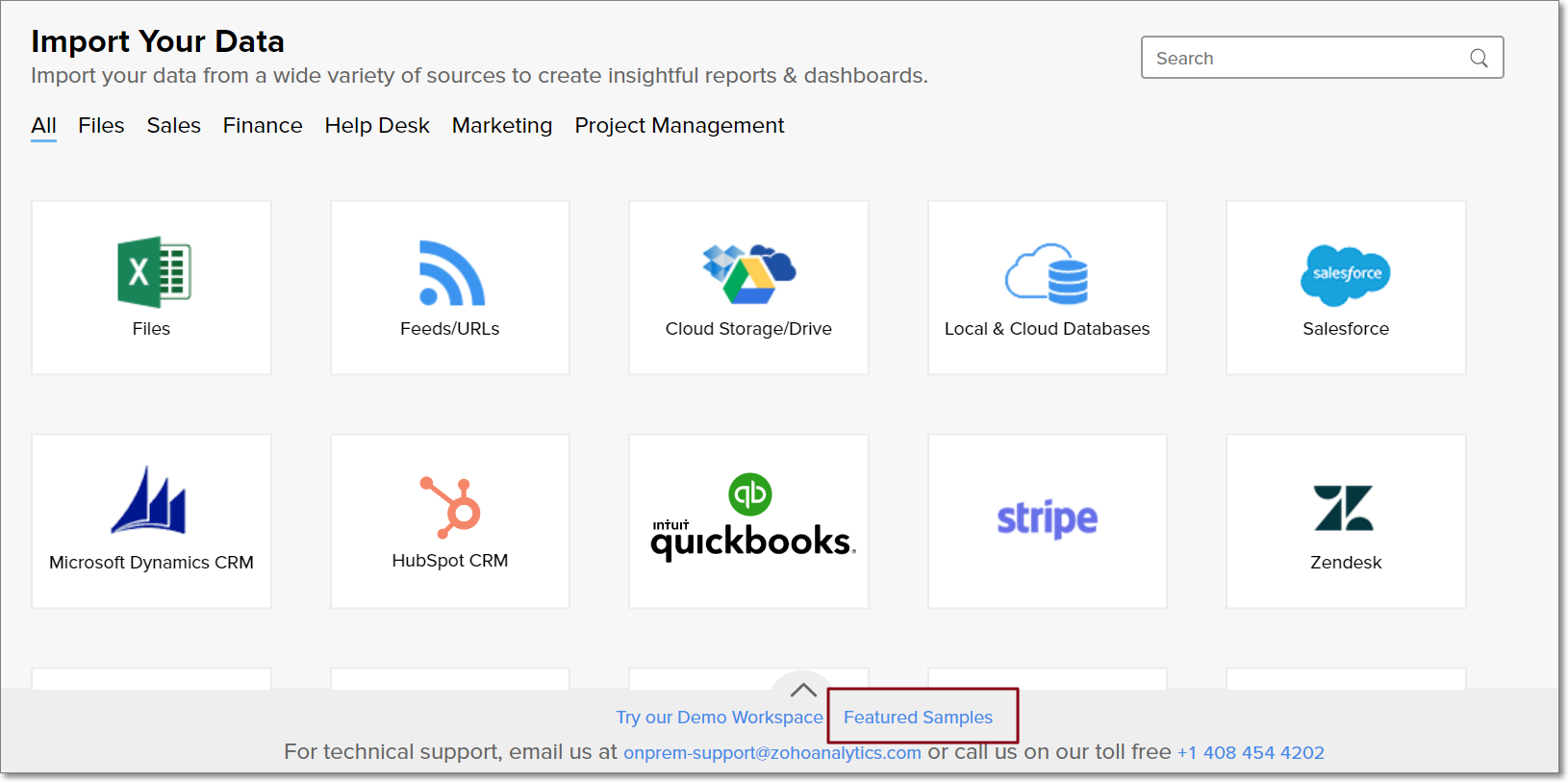 Zoho Analytics provides a set of featured sample workspaces, to facilitate a better understanding of the features offered. To access these workspaces, click the Featured Samples button at the bottom of the Zoho Analytics homepage.