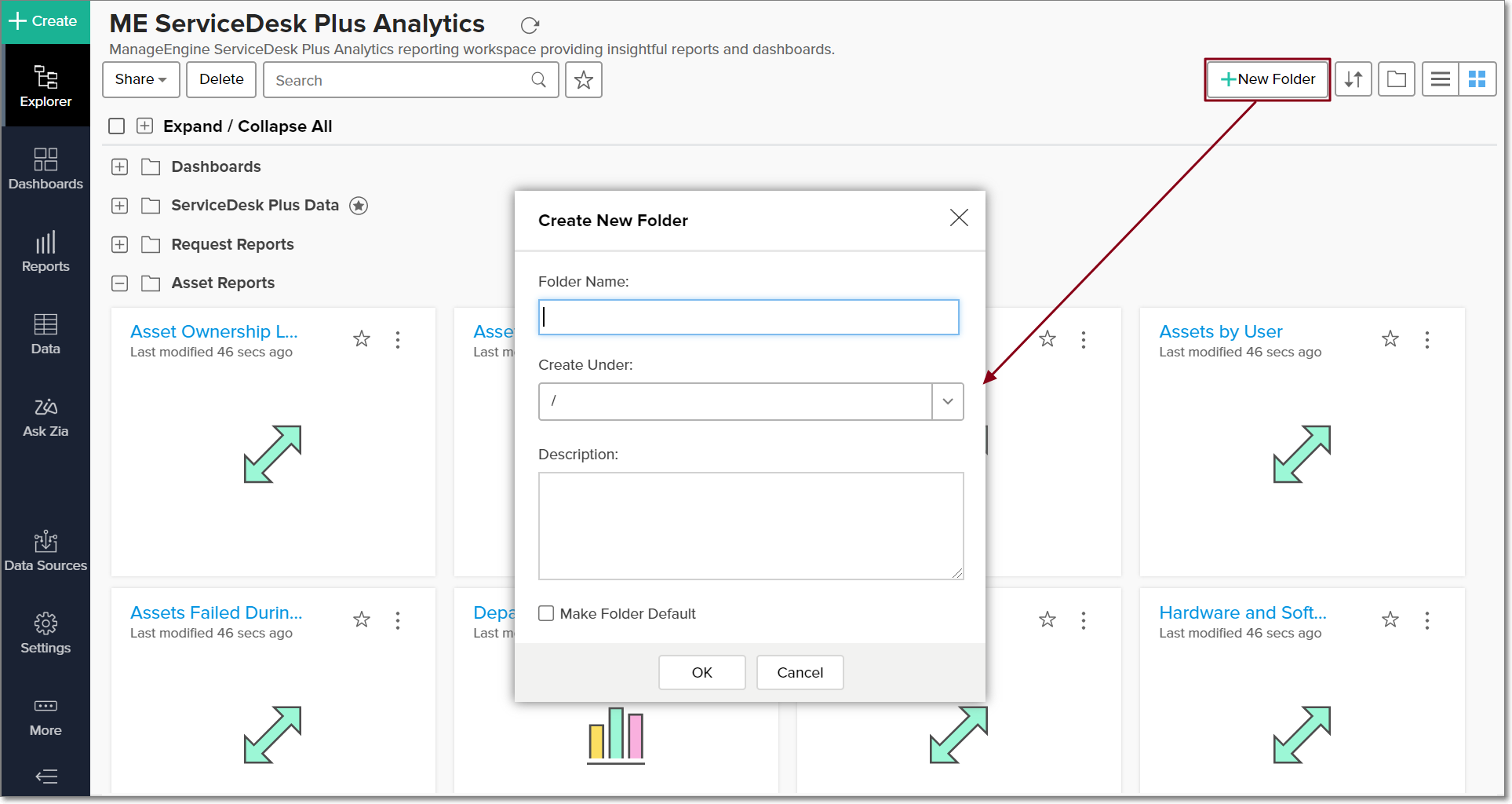 In the Create New Folder popup that appears, provide a name and description for the folder. To create a sub-folder, select the folder under which you want to create the sub-folder from the Create Under drop down. Else, select the / option from the Create Under drop down.
