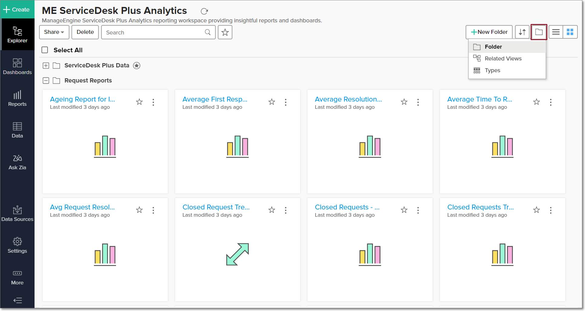 Zoho Analytics allows you to display views in the Explorer in either of the following layouts.