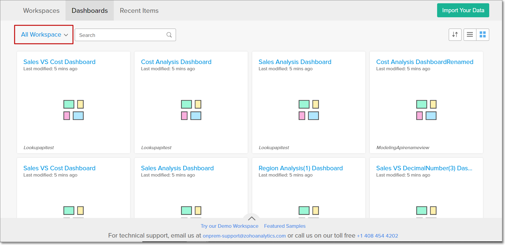 To view the dashboards that you have access to, navigate to the Dashboards tab in the Zoho Analytics homepage. You can view the dashboards that you have created, or only the ones that have been shared to you, by navigating to the corresponding tabs. To list dashboards specific to individual workspaces, select the required workspace from the All Workspace drop down.