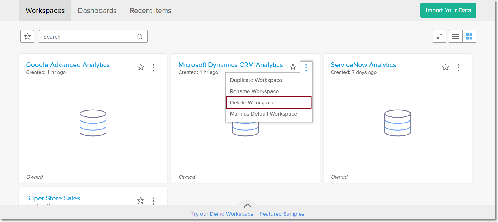 To delete a workspace, navigate to the required workspace in the Zoho Analytics homepage, and click the More Actions icon. Select the Delete Workspace option and confirm your action in the popup that appears.
