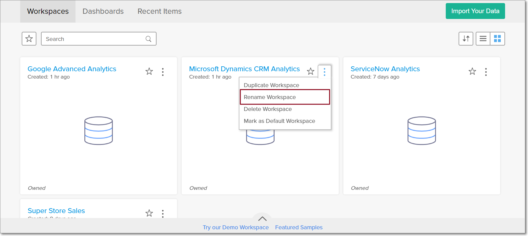 Follow the steps below to rename a workspace in Zoho Analytics.