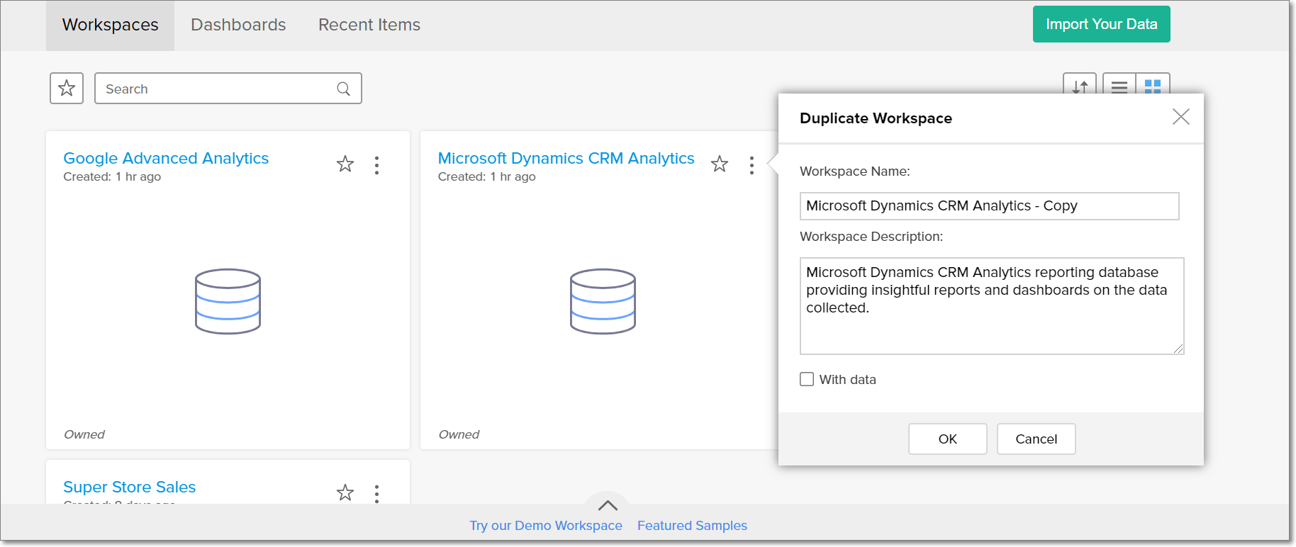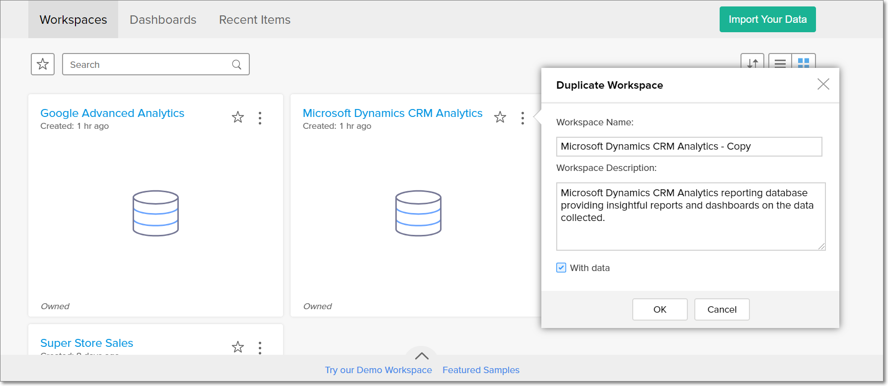Select the Duplicate Workspace option, provide a name and description for the duplicate workspace, select the With data checkbox, and click OK.