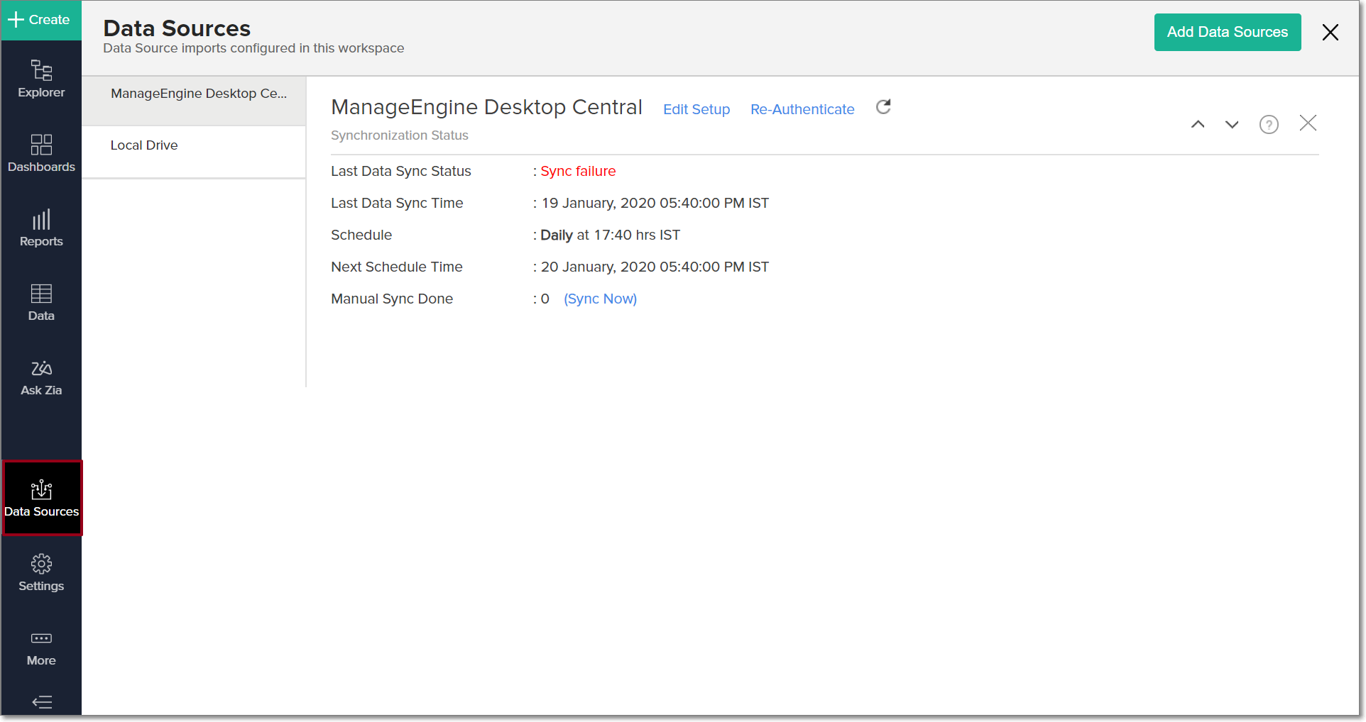 To view the source from which data has been imported into the workspace, click the Data Sources button from the side panel of the required workspace. The workspace's data sources will be listed, and clicking on a required data source will display the import configurations of that source.
