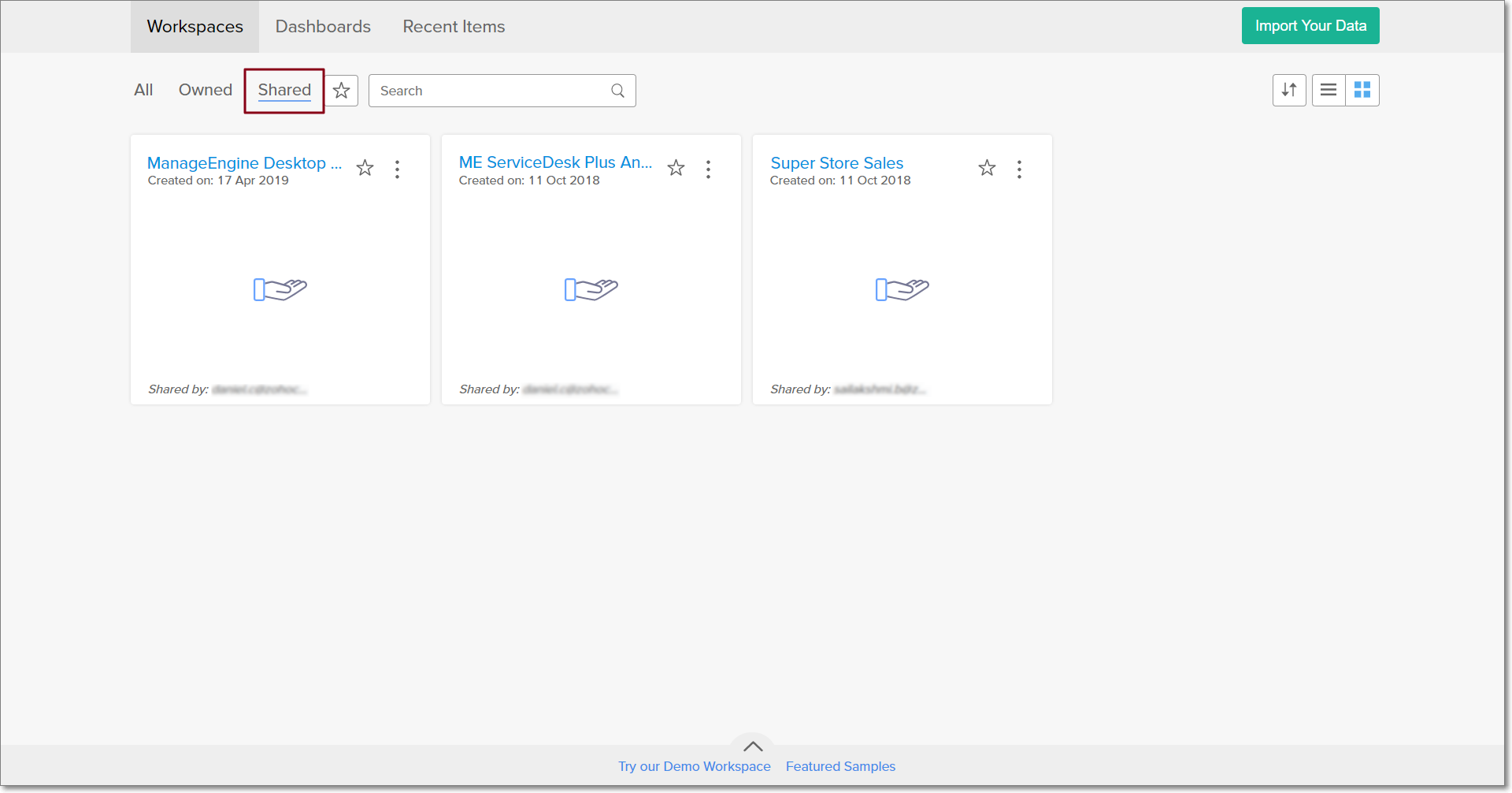To view the workspaces that have been shared to you, navigate to the Workspaces section of the Zoho Analytics homepage, and click the Shared button. This lists the shared workspaces, along with the details of the workspace owner.