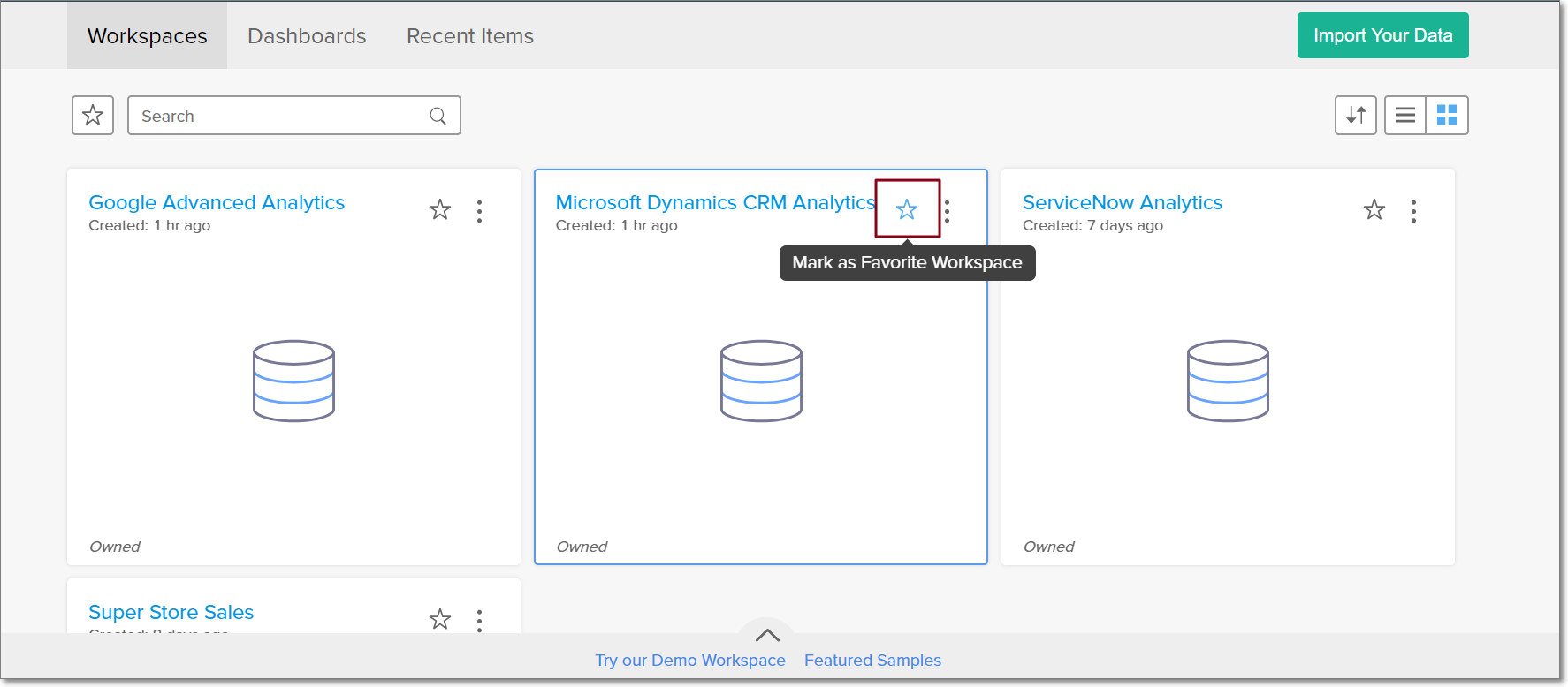 To bookmark frequently accessed workspaces, navigate to the required workspace in the Zoho Analytics homepage and click the Star icon.