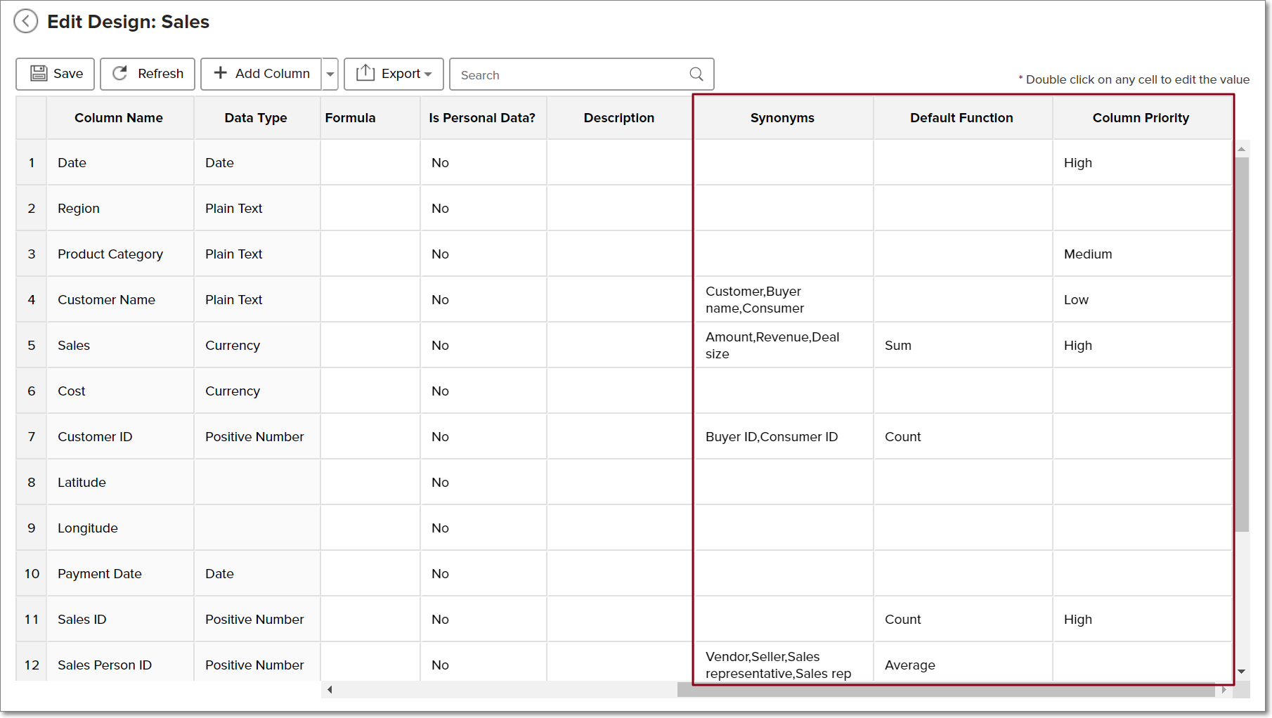 Using the table's Edit Design mode: By opening a table and clicking Edit Design, you can modify the Synonyms, Default Function and Column Priority columns to edit Ask Zia's settings.