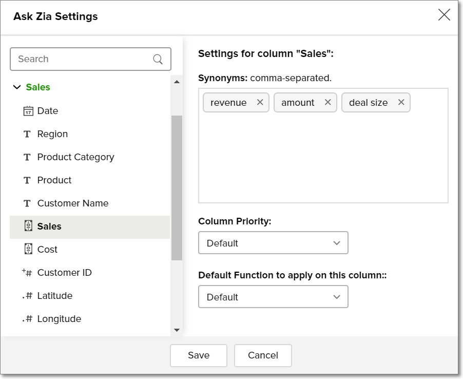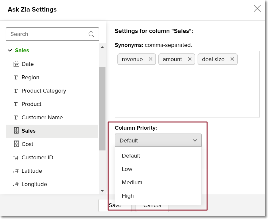 This option allows you to specify the priority in which the columns should be considered by Ask Zia. When you have multiple columns with similar names in your workspace, Ask Zia will use the value set in Column Priority to rank the columns and generate reports accordingly.