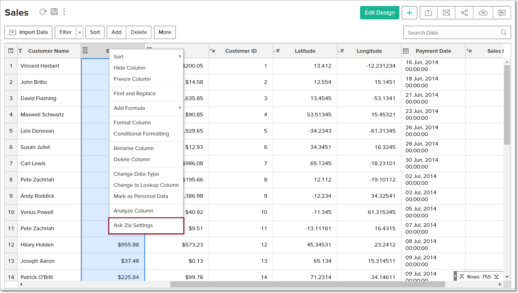 Using Column settings: You can also right-click a column and select the Ask Zia Settings option to access the settings page.