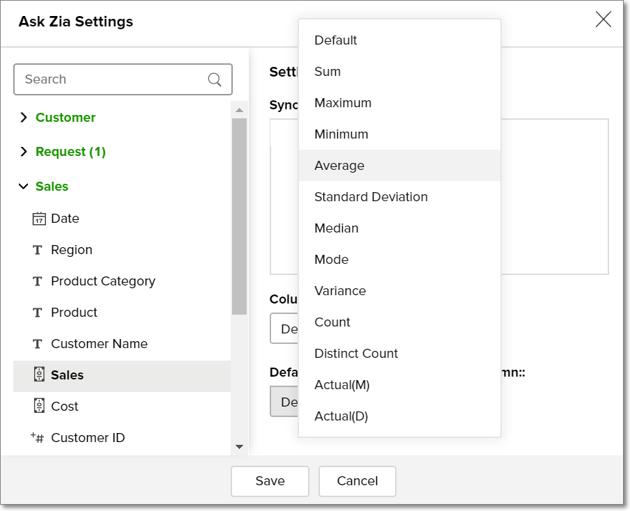 Zoho Analytics provides a wide range of summary functions to summarize the data in your report. By default, Ask Zia will apply the most appropriate summary function over each column, and generate reports accordingly. This function can be changed to other summary functions using the Default Function drop down in the Ask Zia settings page.
