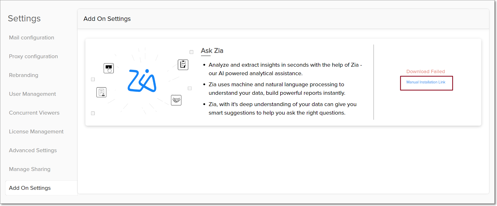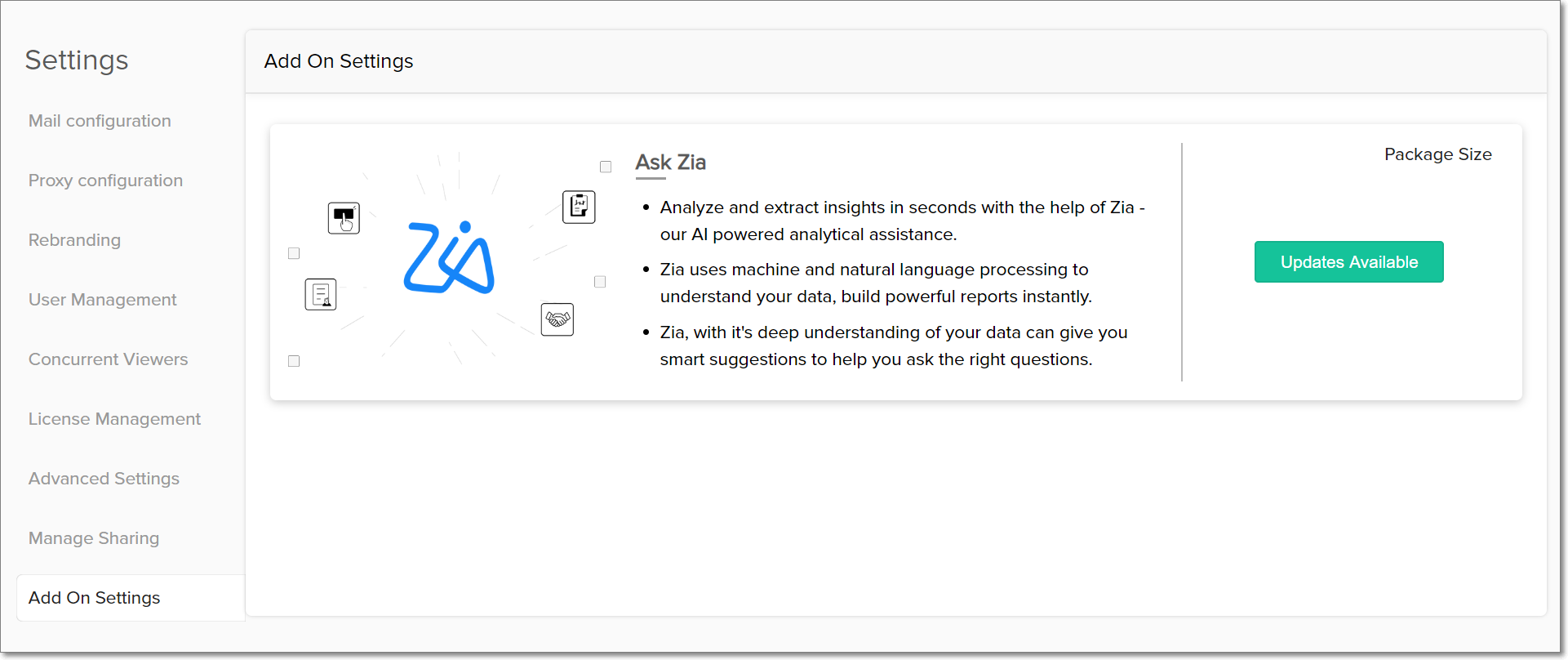 Note: This feature is available only for Zoho Analytics builds 4650 and above. Existing Ask Zia users on these builds can access the latest version by navigating to the Add on Settings screen, and clicking the Updates Available button. This downloads the latest version of Ask Zia, which can be set up by following the procedure detailed here.