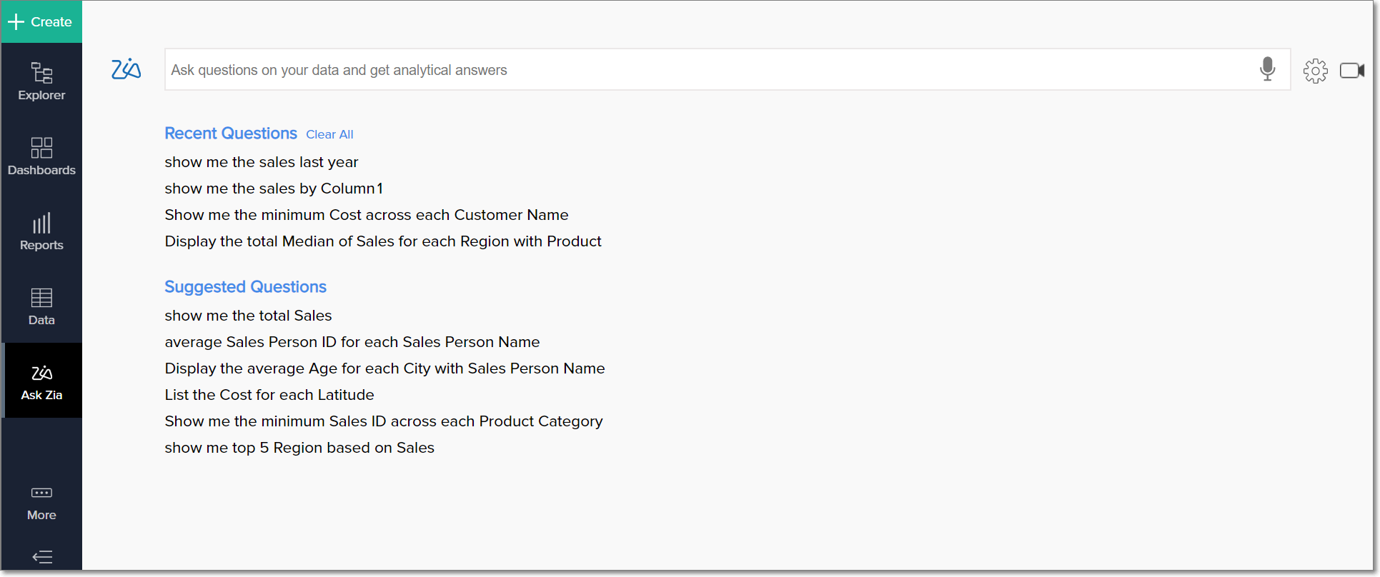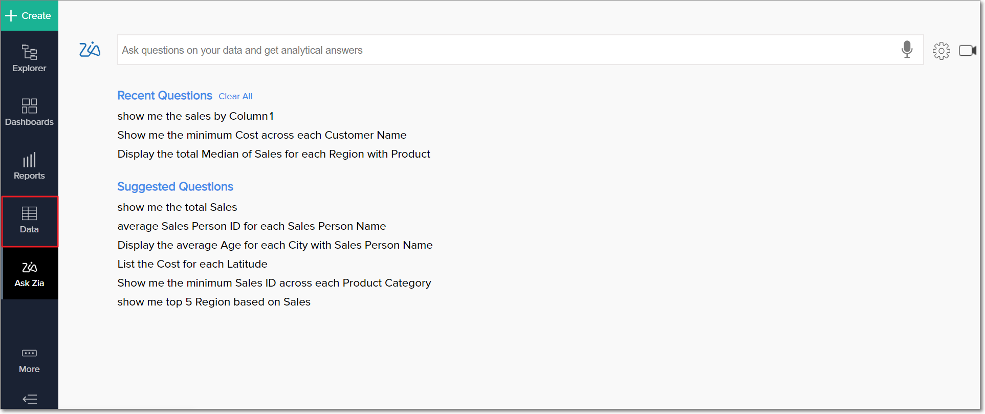 To access Ask Zia, click the Ask Zia button found in the side panel of your workspace. This opens the Ask Zia page.