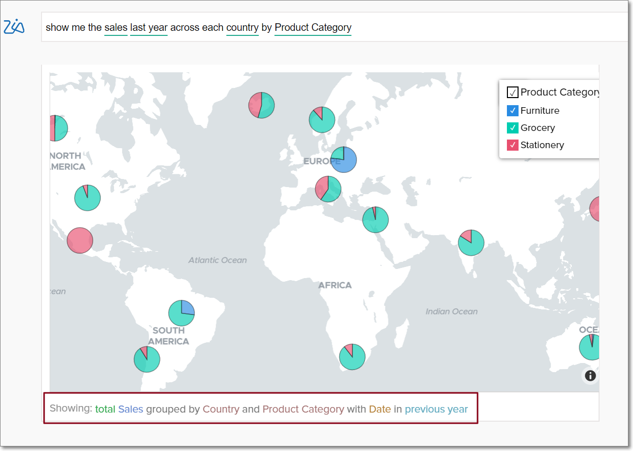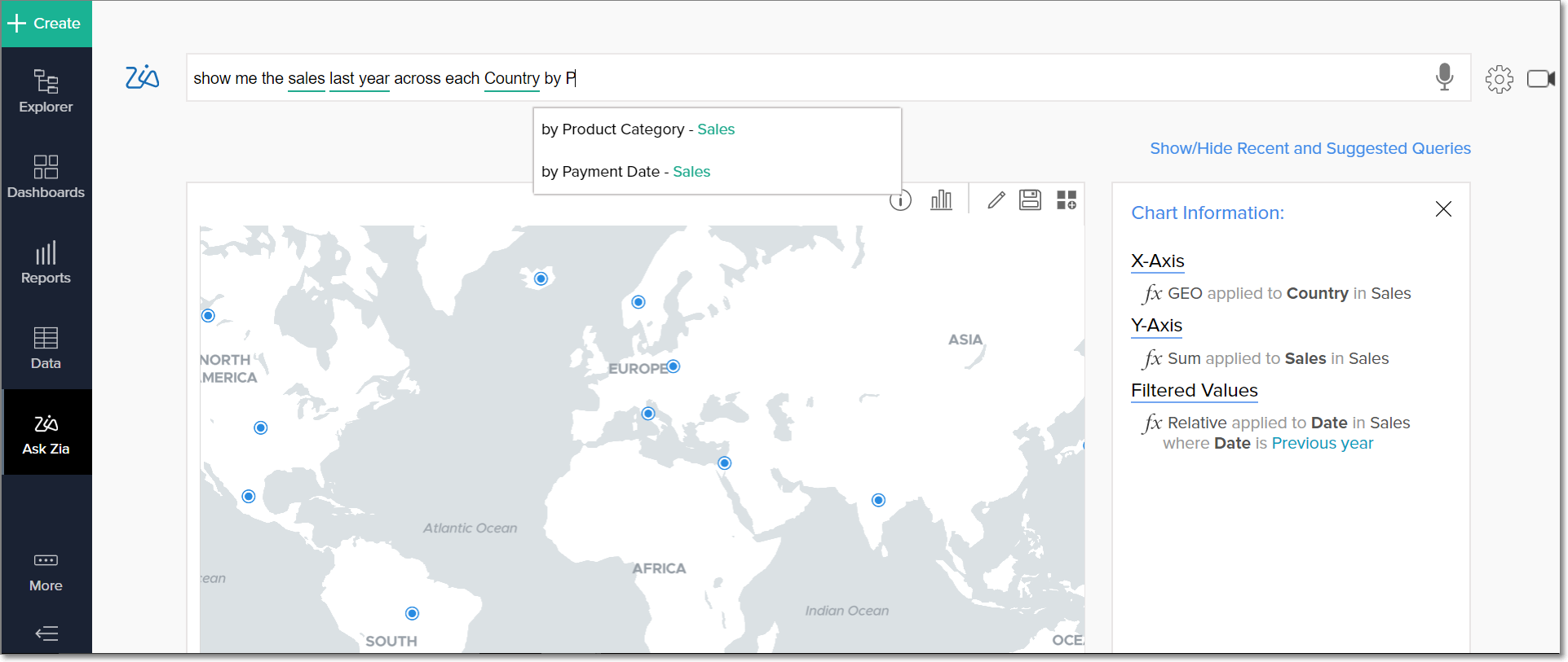 Ask Zia learns from the patterns in your questions and provides intelligent and personalized suggestions to assist you in drafting the question. These suggestions are based on the relationship among the tables, previous history, Ask Zia customizations, etc. The Auto Suggestion also suggests supporting phrases (such as Top 10, Bottom 10), sort options, chart types, and more.