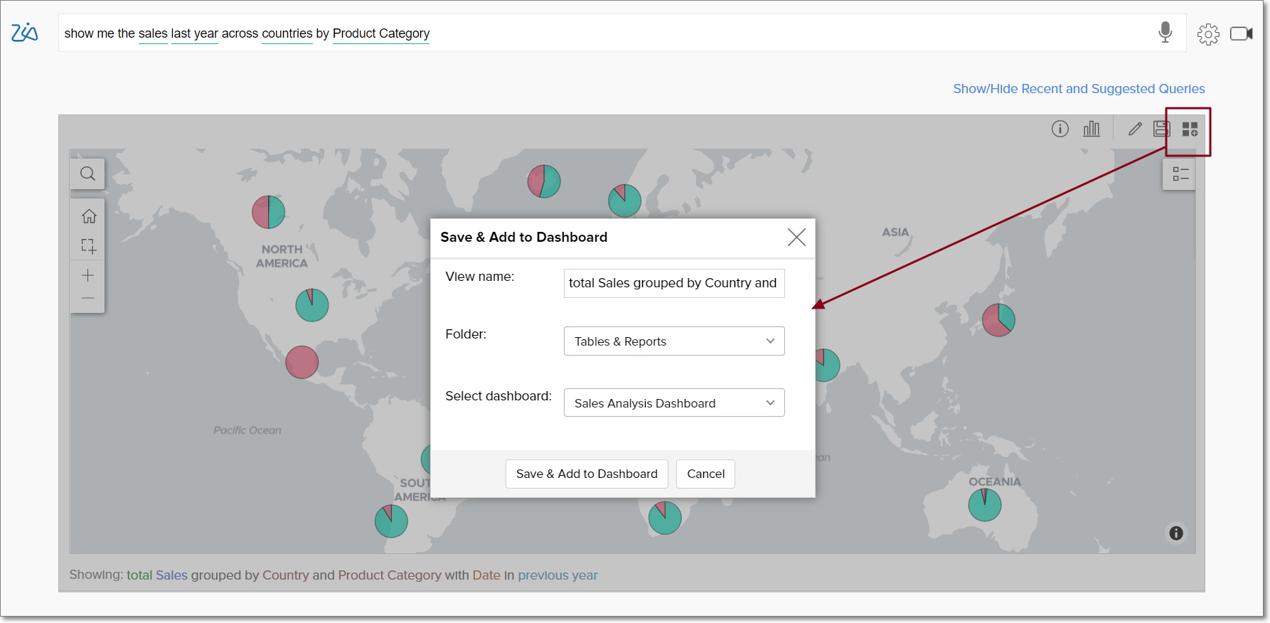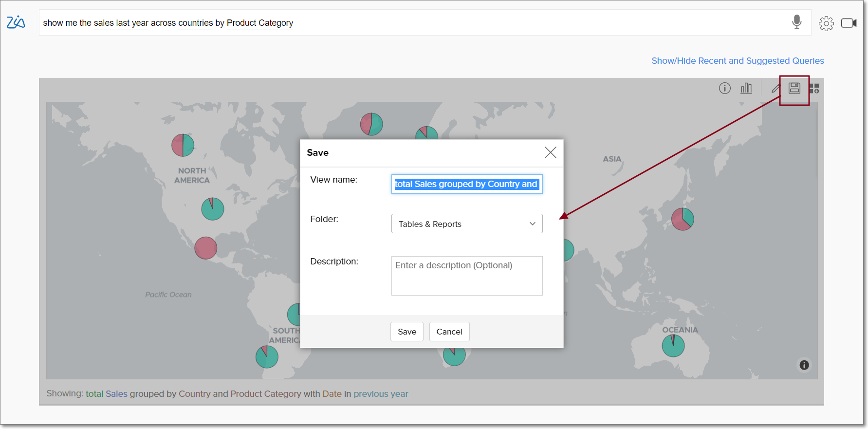 To save the report generated by Ask Zia, click the Save button in the top right corner. In the dialog that opens, specify the view name, folder and description, and click Save.