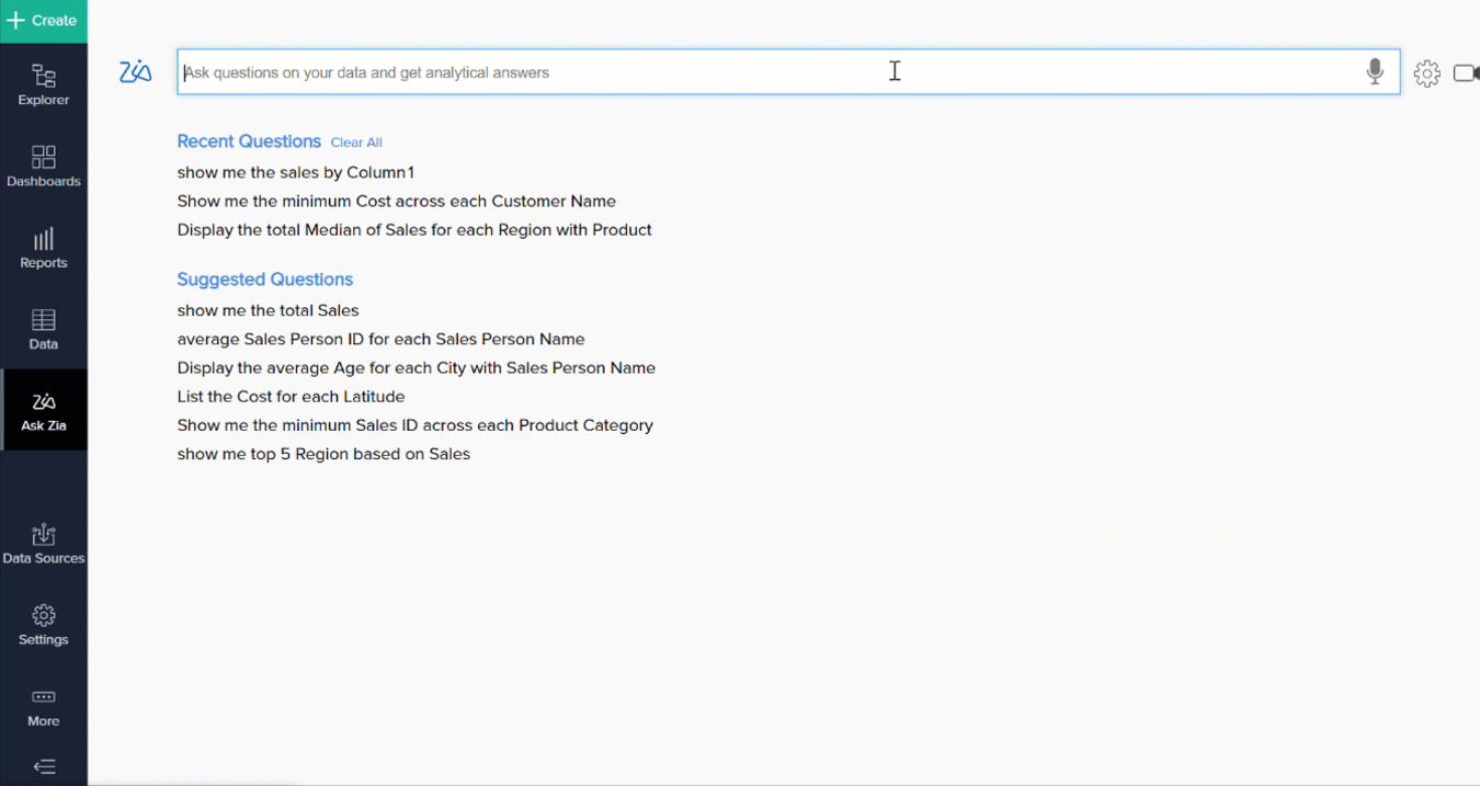 Type your question into the text box provided. Ask Zia will interpret the question and will generate the best possible report as an answer.