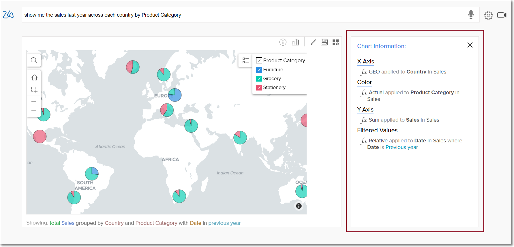 The report information section lists the report details in depth, and will be displayed next to each generated report. For charts, it displays the columns in the X and Y axes, the column used in the color shelf, the functions applied over each column and the filters used in the report. In case of pivot views, the columns used in the row, column, and data shelves are listed.