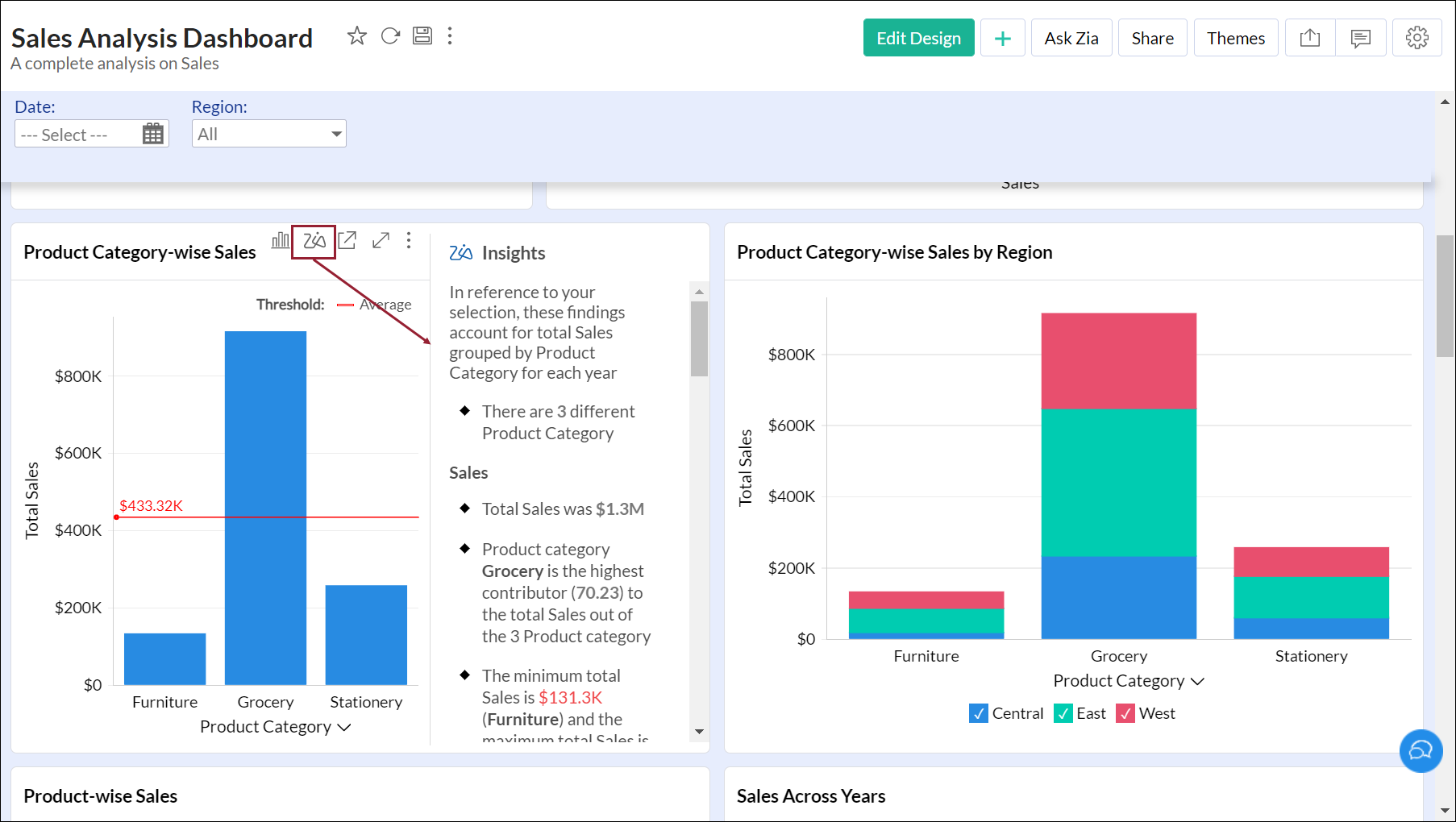 To access insights on a report embedded in a dashboard, open the dashboard, expand the required report and click the Zia icon on the top right corner. A popup appears, displaying the detailed insights on the selected report.