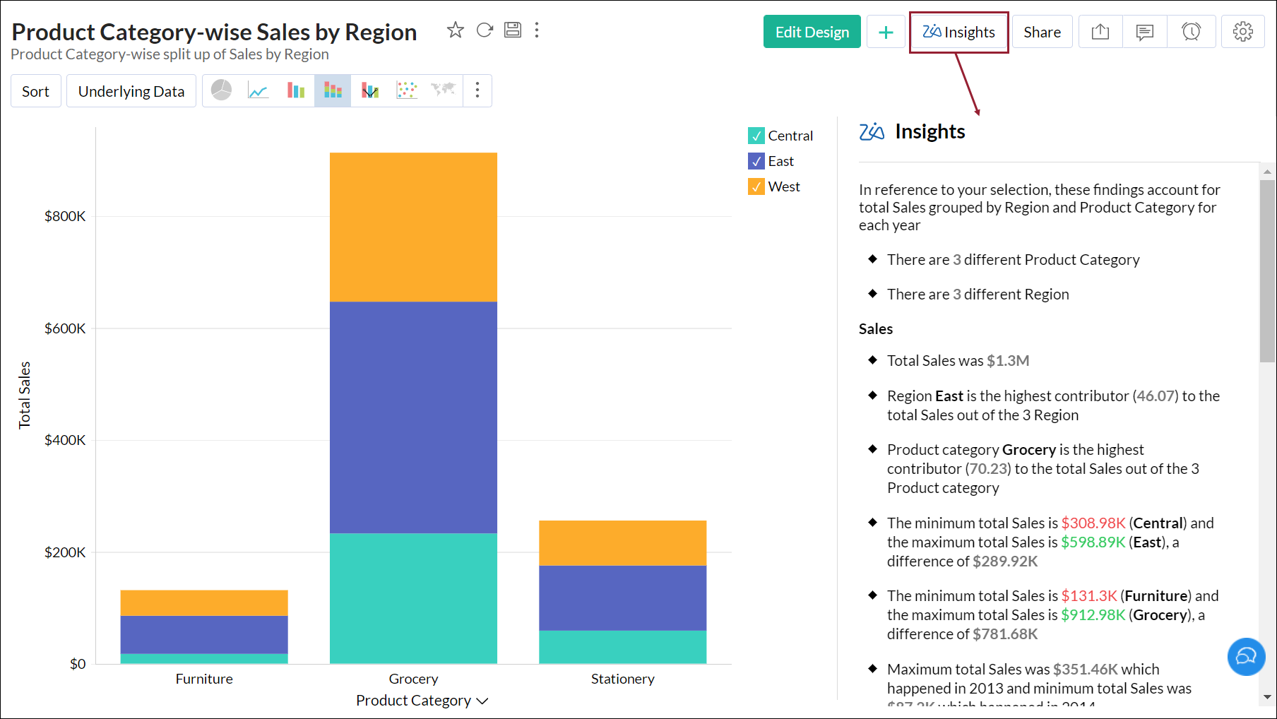 To access immediate insights on a report, open the required report and click the Zia Insights button on the top right corner. A popup appears displaying the required information.