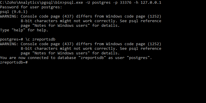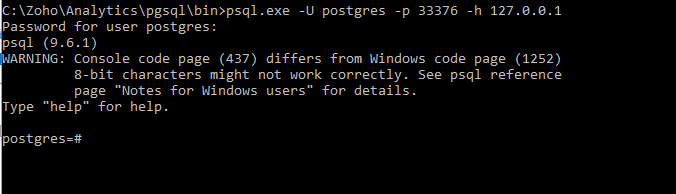 C:\zoho\Analytics\pgsql\bin>psql.exe -U postgres -p 33366 -h 127.0.0.1