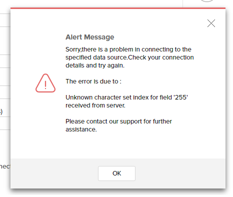 Unknown initial character set index '255' received from server.