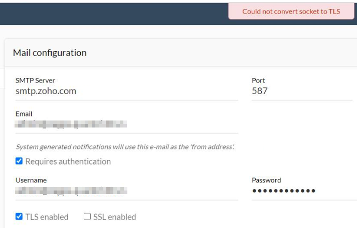 1. [15:58:32:717]|[03-31-2021]|[SYSERR]|[INFO]|[55]: org.apache.commons.mail.EmailException: Sending the email to the following server failed : smtp.zoho.com:587